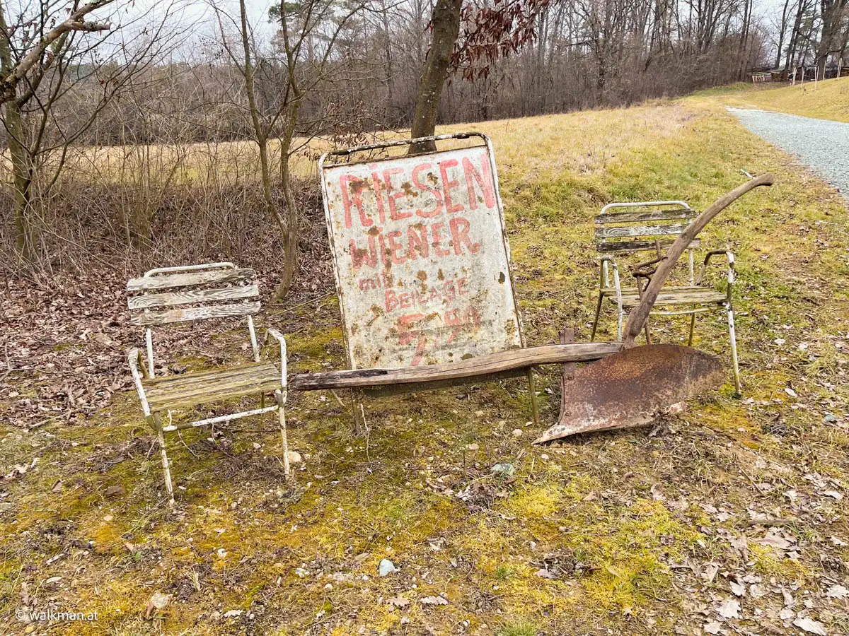 Kurze Zeit später wandern wir an einem Kuriosum aus der Vergangenheit vorbei. Hier hat jemand, am Grundstücksrand eines Hauses, zwei Stühle platziert und in deren Mitte ein, für heutige Verhältnisse, allzu verlockendes Schild.