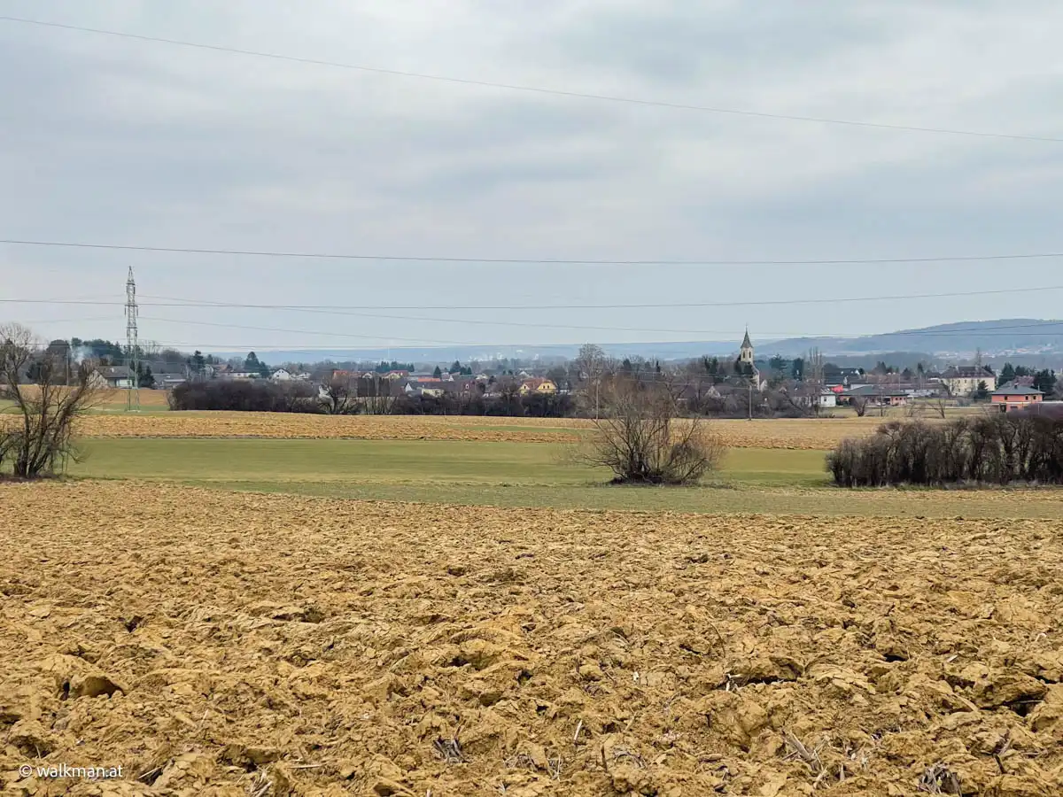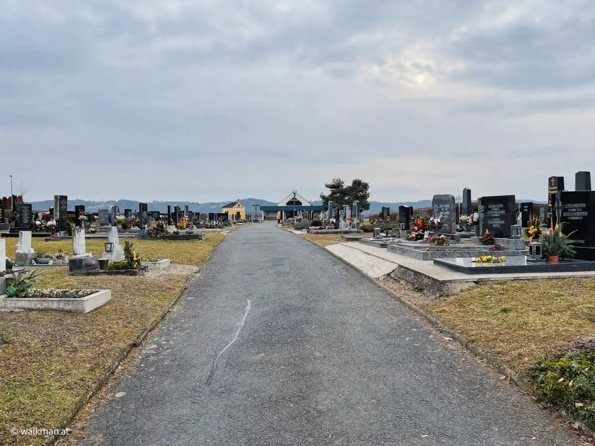 Vorbei an der Ortstafel und dem Friedhof mit Kirchenblick erreichen wir nach insgesamt 4,7 Kilometern oder 1,5 Stunden Wegzeit, inklusive Pausen, wieder unser Vehikel am Parkplatz.