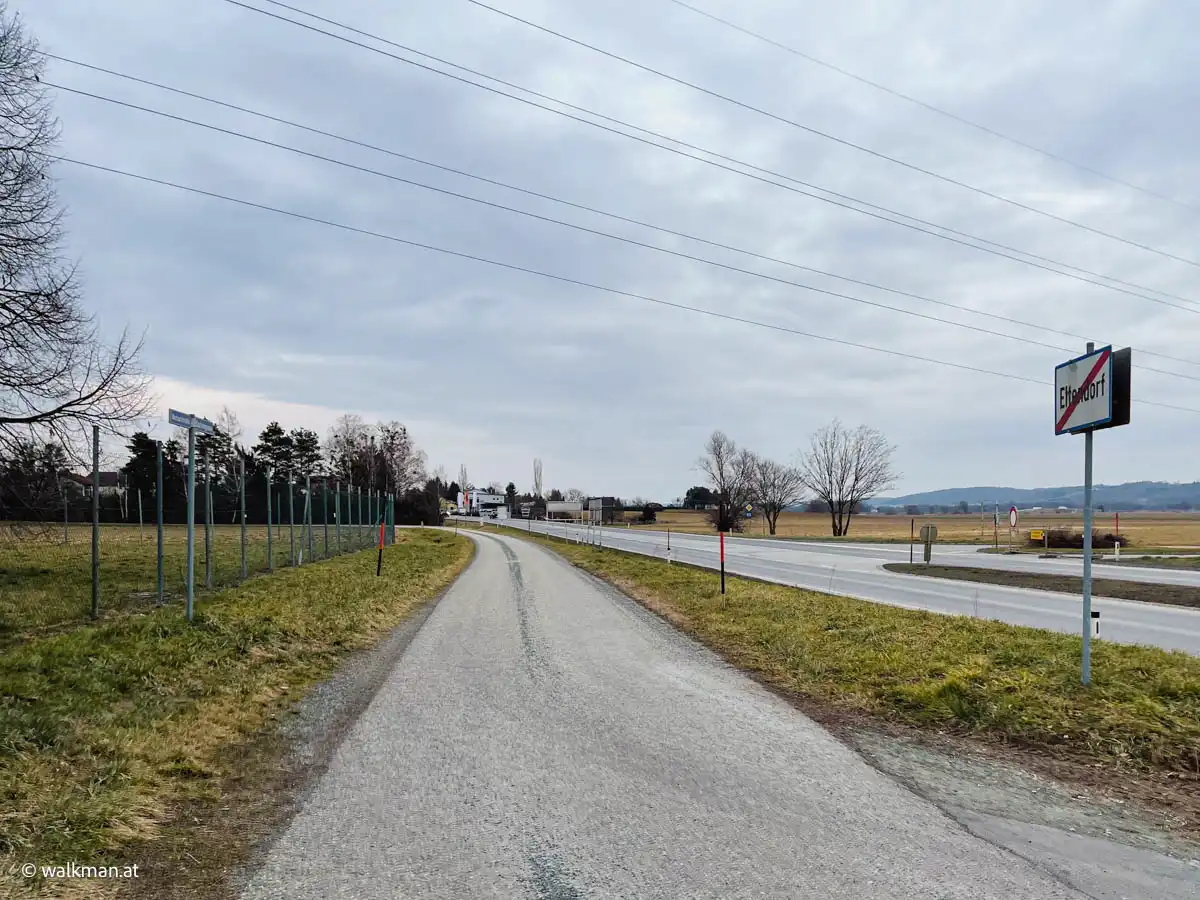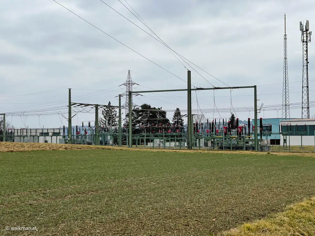 Am Ende der Marbachstraße schwenken wir beim, hier positionierten, Umspannwerk nach links und wandern am Radweg neben der Bundesstraße zurück Richtung Eltendorf. Mittlerweile sind 1 Stunde und 20 Minuten vergangen und wir befinden uns nach 4 Kilometern nun auch schon am letzten Teil unserer heutigen Tour.