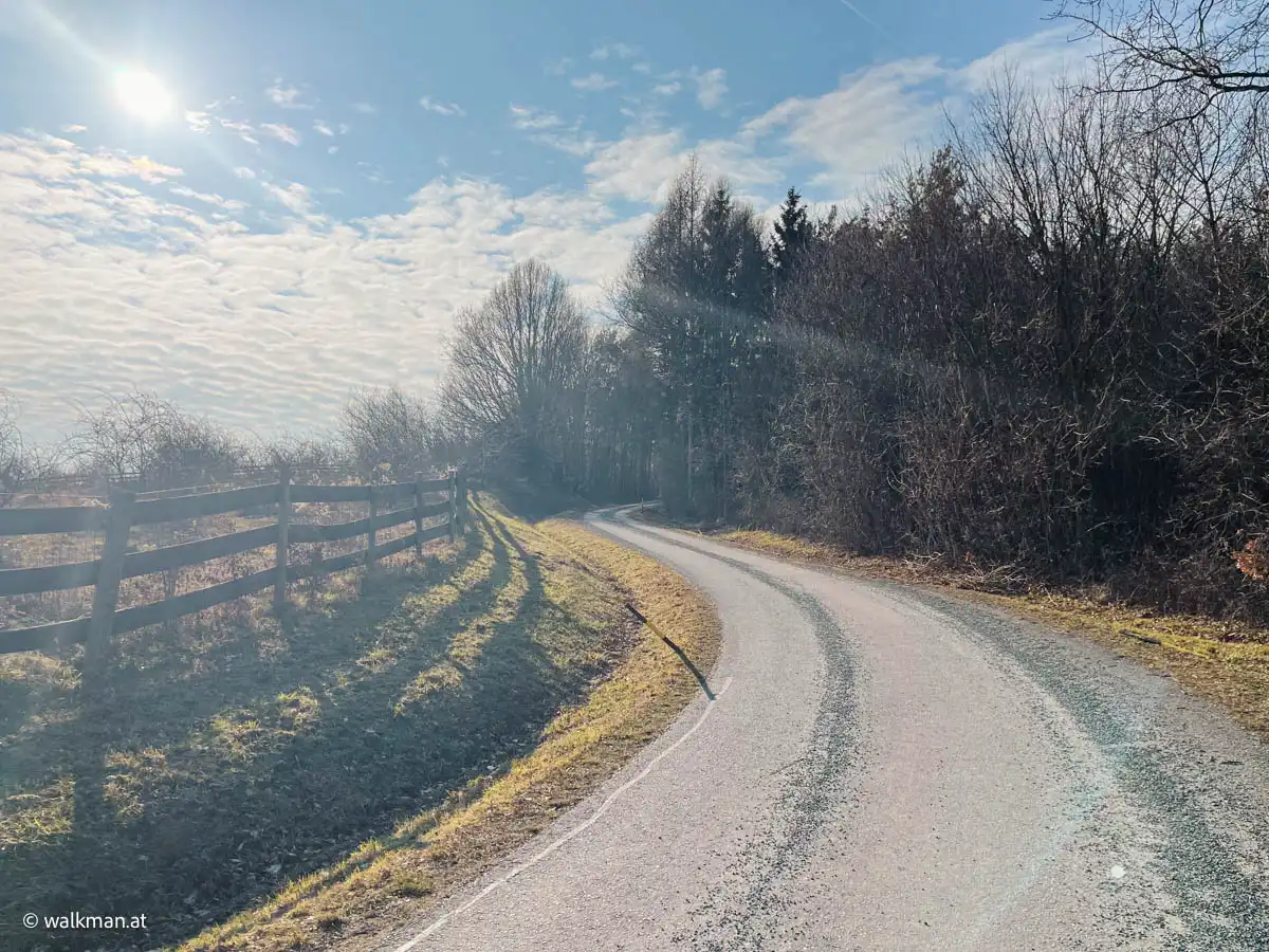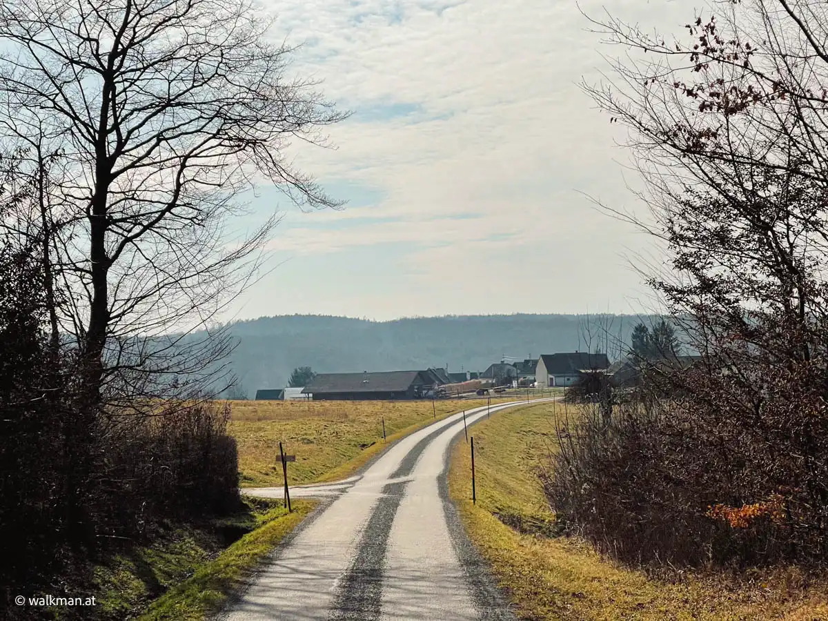 Abermals etliche Fotos später und wieder ein Streckenabschnitt weiter betreten unsere Wanderschuhe wieder Asphalt. Diesmal ein letztes Mal. Wir waren nun wieder am Güterweg angekommen, der uns zum Auto begleiten und leiten wird. Ebenso gesellte sich nun auch wieder ein alter Bekannter zu uns. Sein Name: Anstieg. Auf dieser Tour ein wirklich treuer Begleiter.