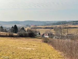 Am gegenüberliegenden Hügel sehen wir auch die Kapelle am Geiderberg, an der ich bereits gerastet hatte. Aber da werden wir heute nicht vorbei kommen. Unsere runde Route führt unten, zwischen den beiden Hügeln links weg, abermals hinauf in den Winkelwald zurück. Aber zuerst geht es jetzt wieder bergab.