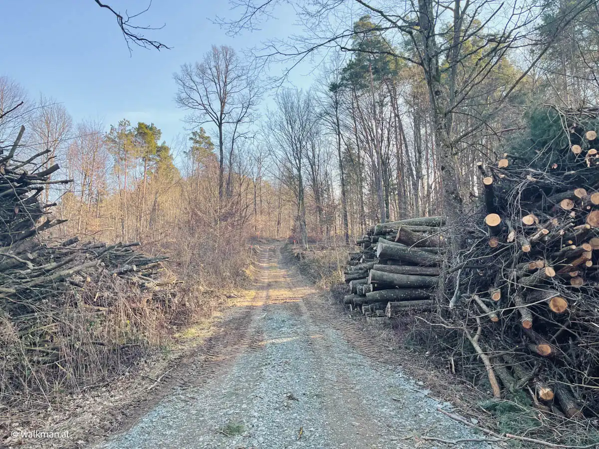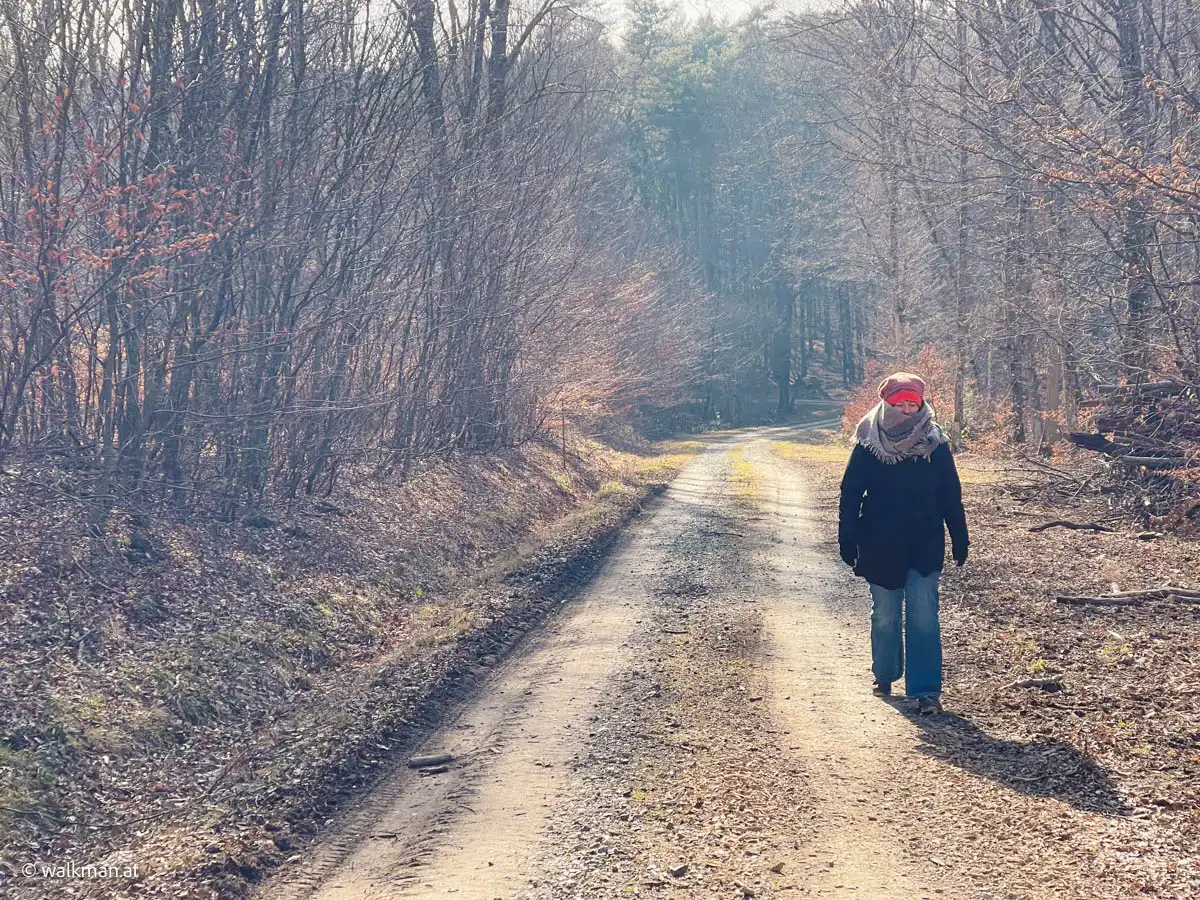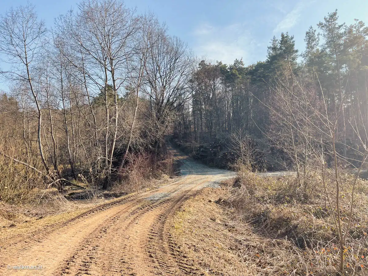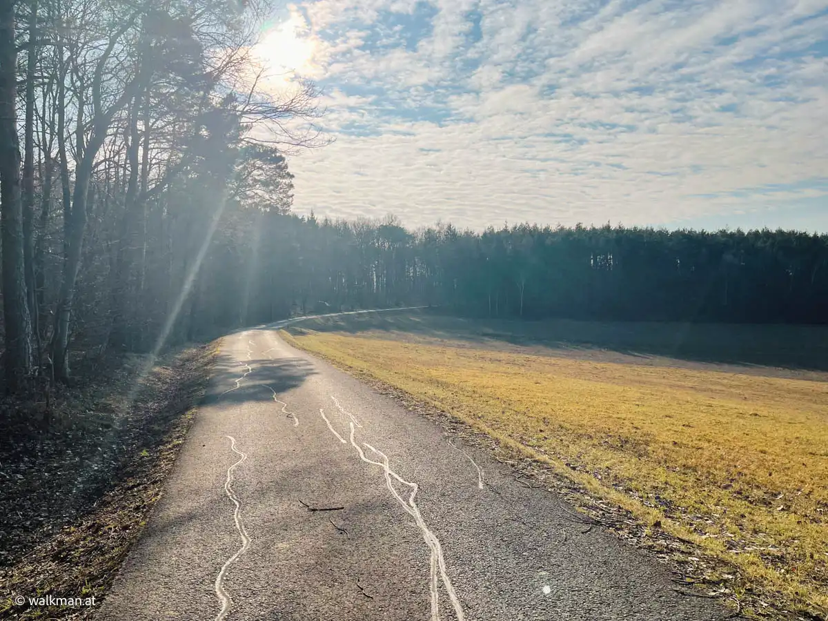 Nachdem wir uns wetterfest ausgerüstet hatten, starteten wir auch schon. Zunächst nach Süden, Richtung Reinersdorf, auf dem asphaltierten Güterweg, der Reinersdorf mit Heiligenbrunn verbindet, durch den Wald. Und unser Start verlief heute durchaus angenehm. Leicht bergab marschierten wir bald wieder aus dem Wald hinaus.