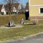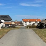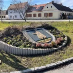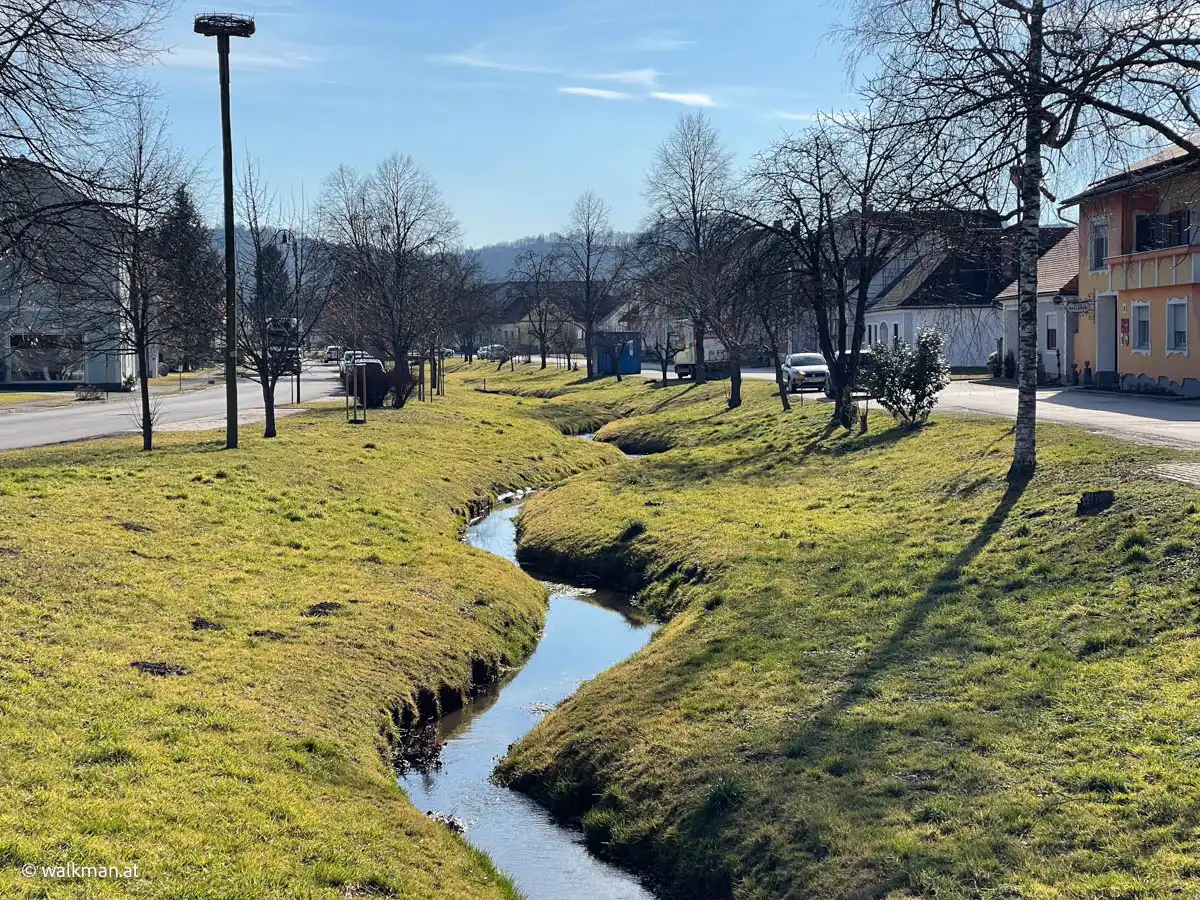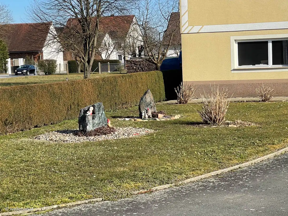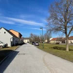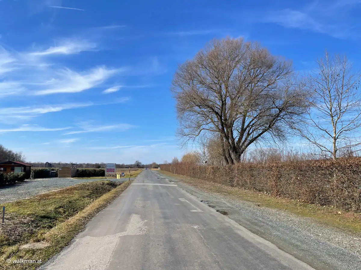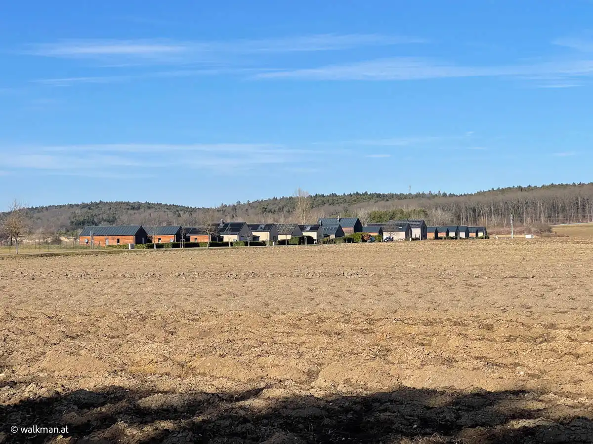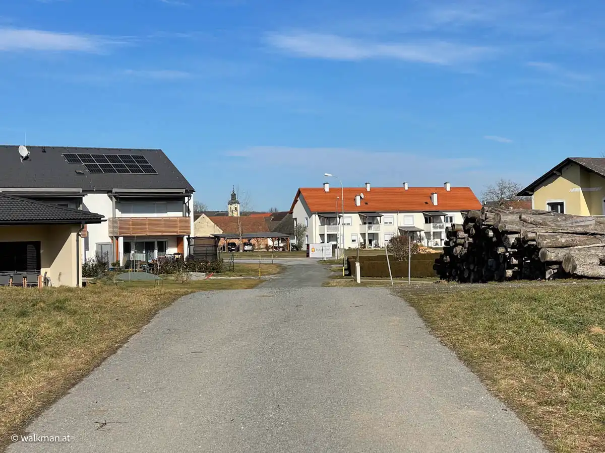 Bei Kilometer 2,9 folgen wir dem Verlauf des Weges, weg von der Lafnitz und über einen kleinen Hügel wieder hinein nach Königsdorf. Vorbei an einer relativ neuen Siedlung mit schmucken Bungalows und neu errichteten Fertigteilhäusern. Zumindest sehen sie danach aus. Der englische Rasen im Garten fehlt dabei natürlich auch nicht.
