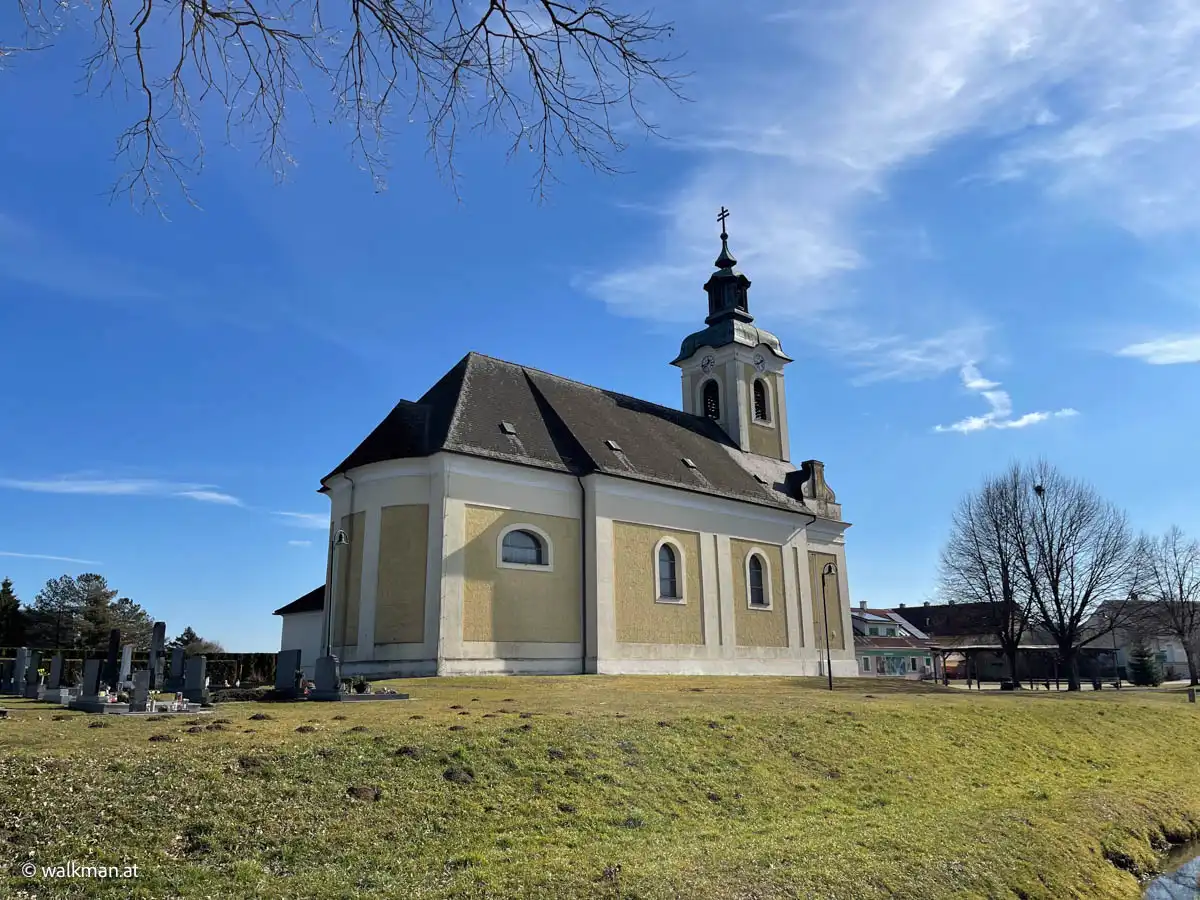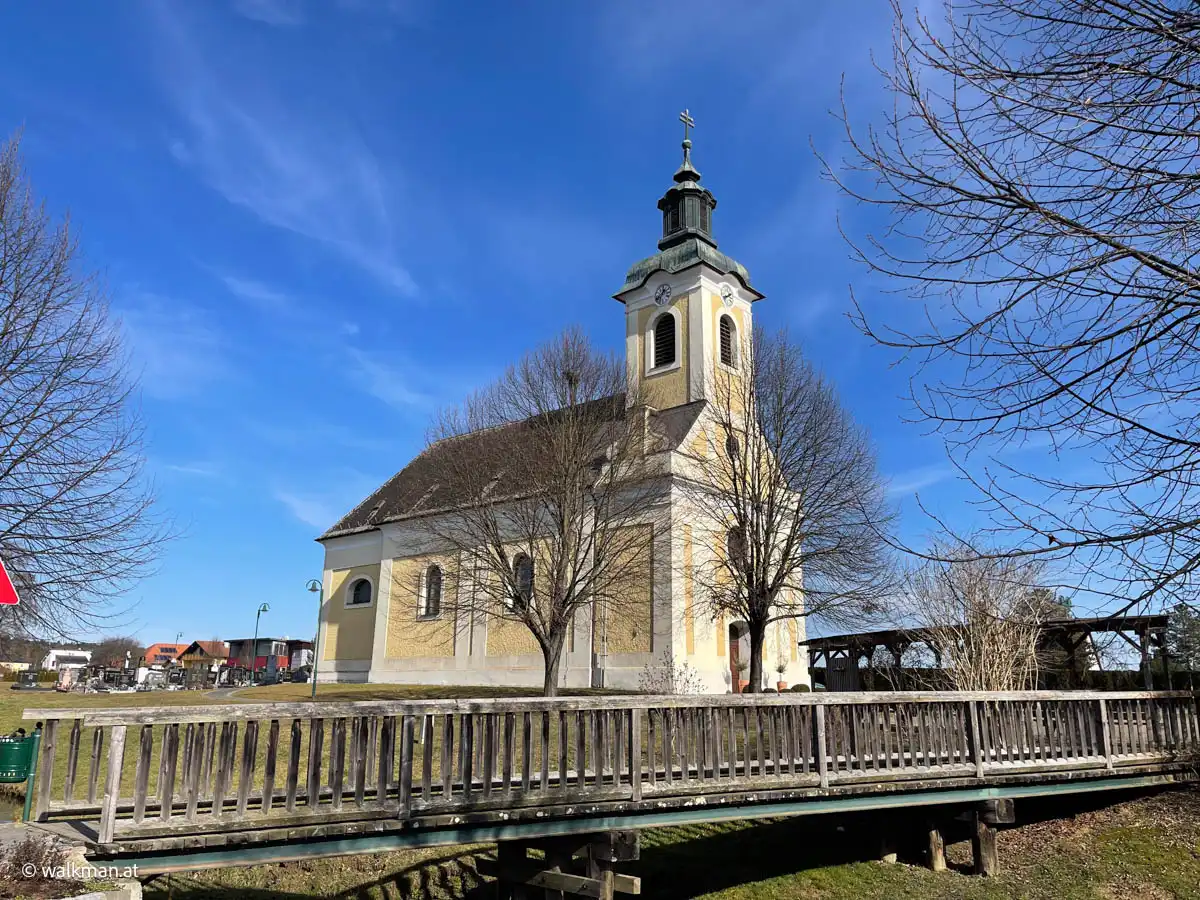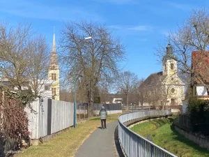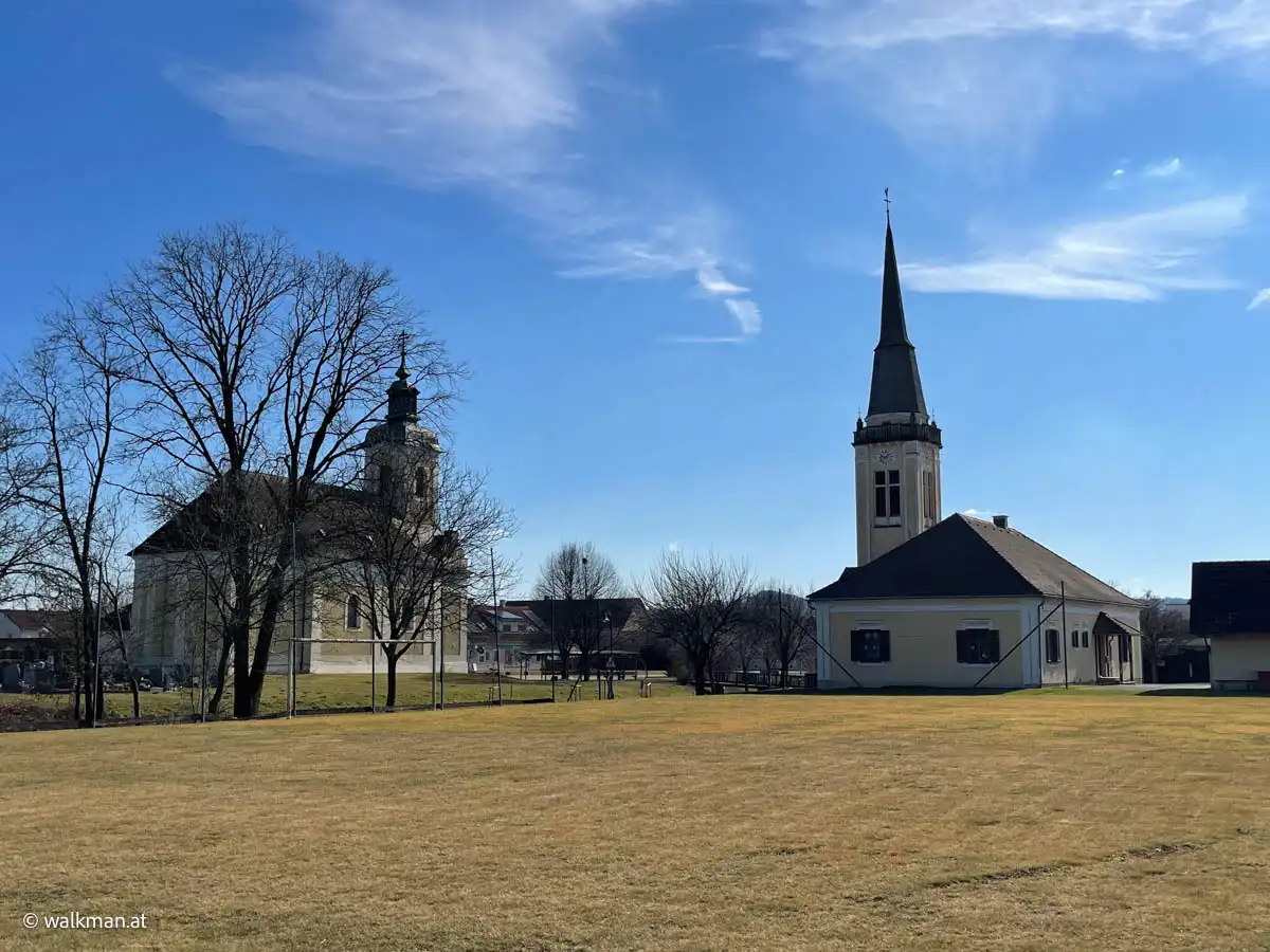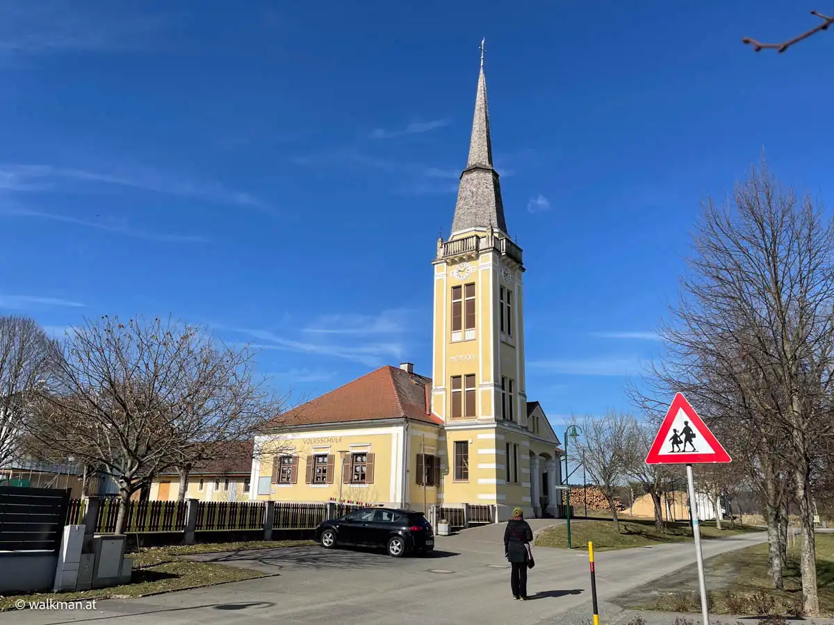 Zu unserer Rechten die katholische, dem heiligen Stephan geweihte, Pfarrkirche von Königsdorf. Und links die evangelische Kirche bzw. das evangelische Schul- und Bethaus, wie es politisch korrekt heißt. Am Glauben, jeglicher christlicher Richtung, kommt man hier sichtlich nicht vorbei.
