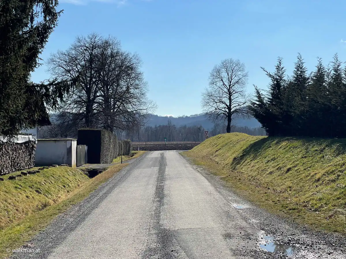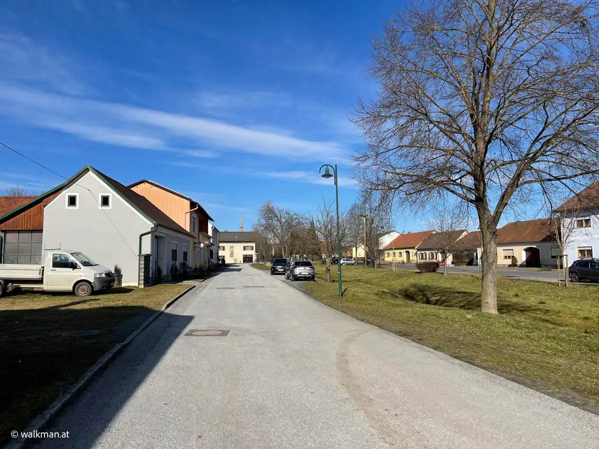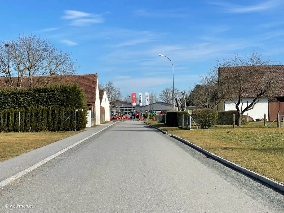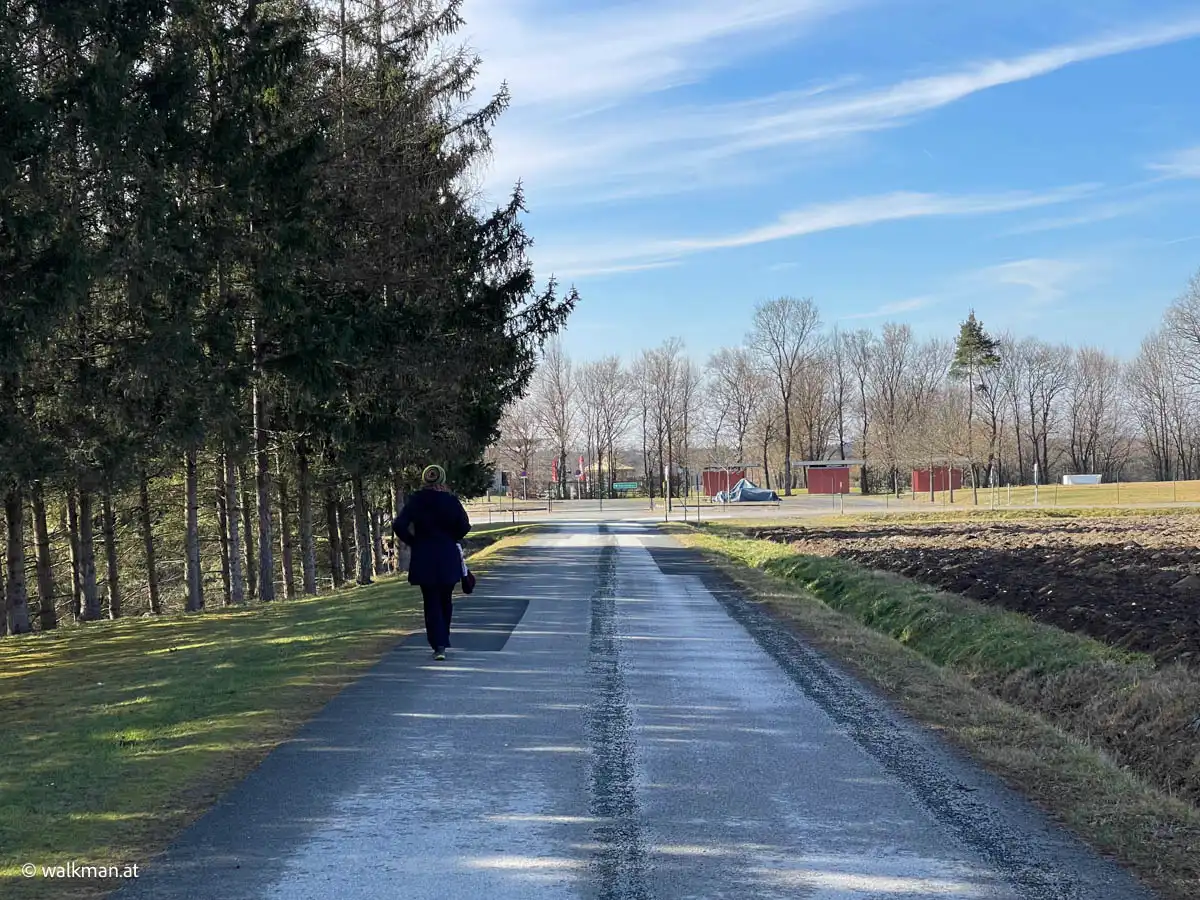 Angekommen an einer Wegkreuzung halten wir uns rechts und marschieren nach vor, zur Hauptstraße. Auf der wir uns bei Kilometer 3,2 nun links halten. Der letzte Abbieger für heute. Nun führt unsere Route nur mehr geradeaus bis zu unserem Vehikel. Vorbei am Gemeindeamt und an einem Hofladen erreichen wir dieses dann kurze Zeit später auch.