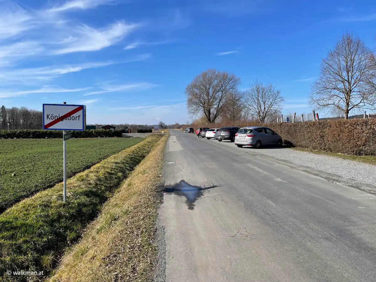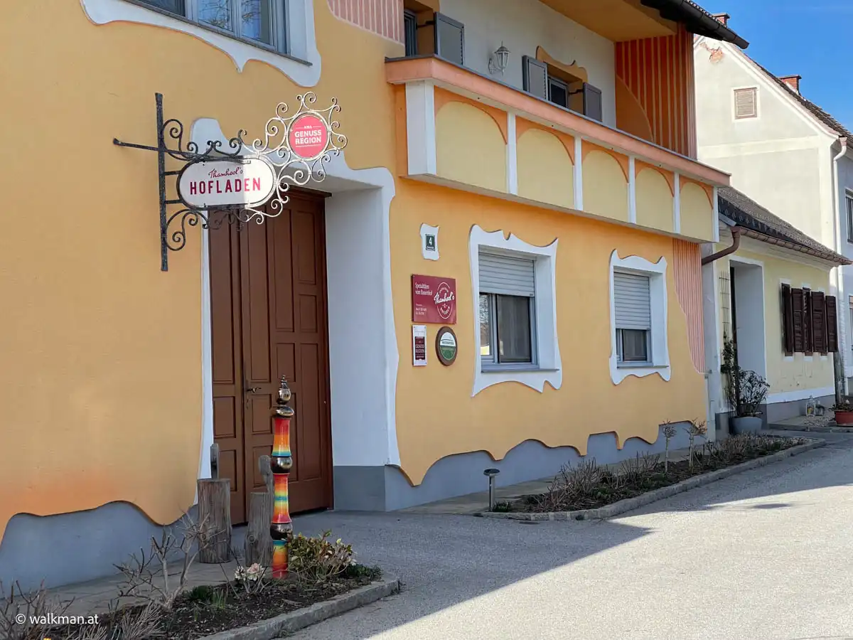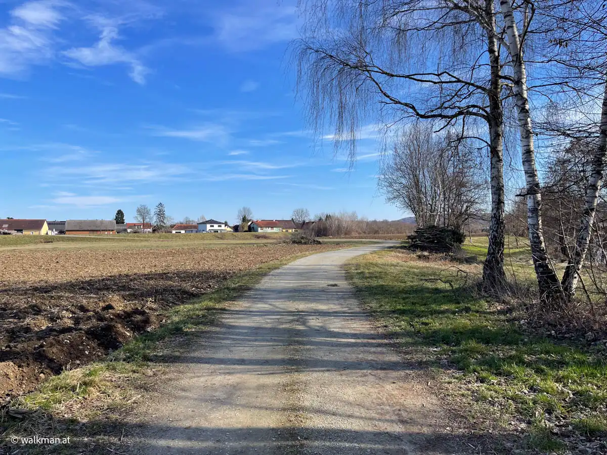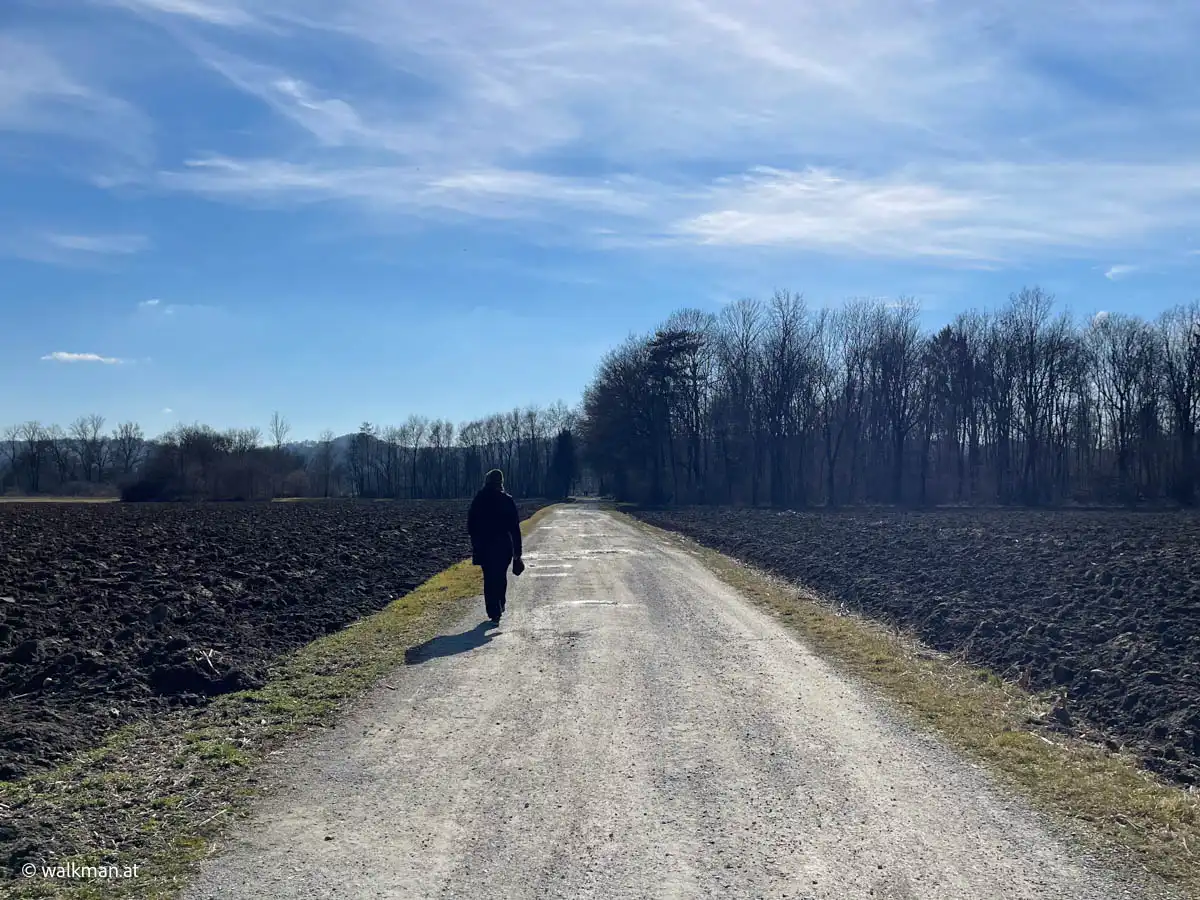 Angekommen an einer Wegkreuzung halten wir uns rechts und marschieren nach vor, zur Hauptstraße. Auf der wir uns bei Kilometer 3,2 nun links halten. Der letzte Abbieger für heute. Nun führt unsere Route nur mehr geradeaus bis zu unserem Vehikel. Vorbei am Gemeindeamt und an einem Hofladen erreichen wir dieses dann kurze Zeit später auch.