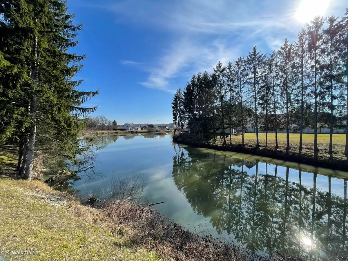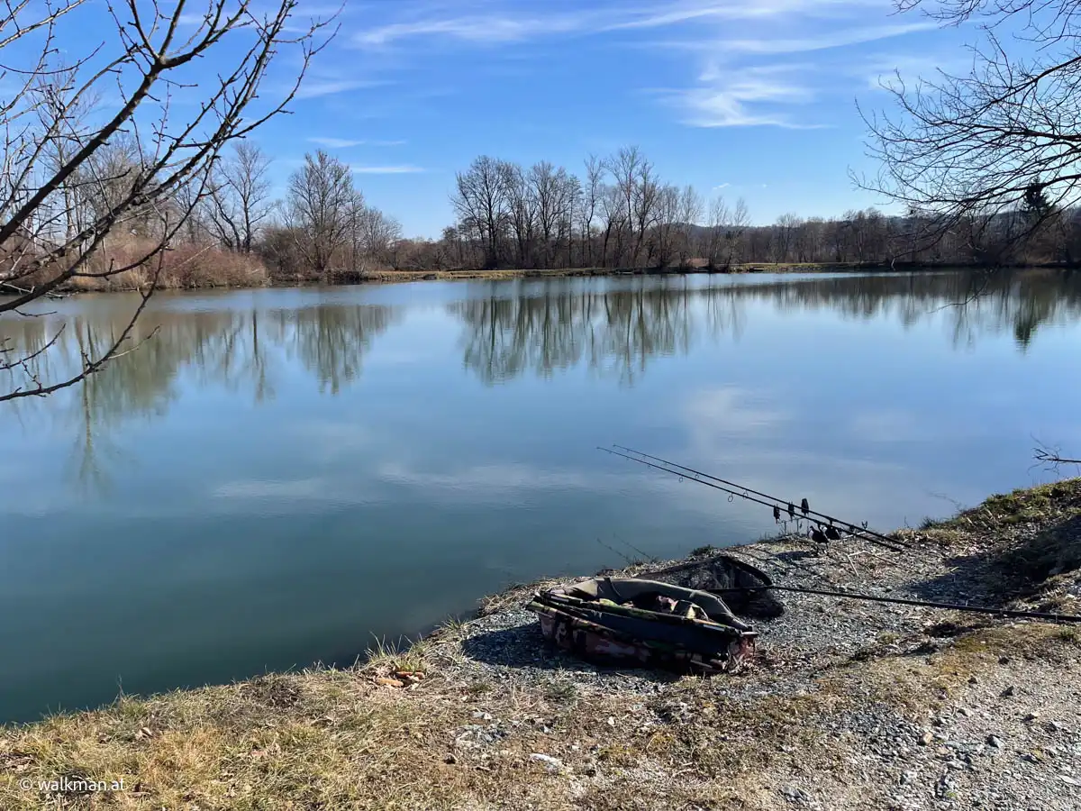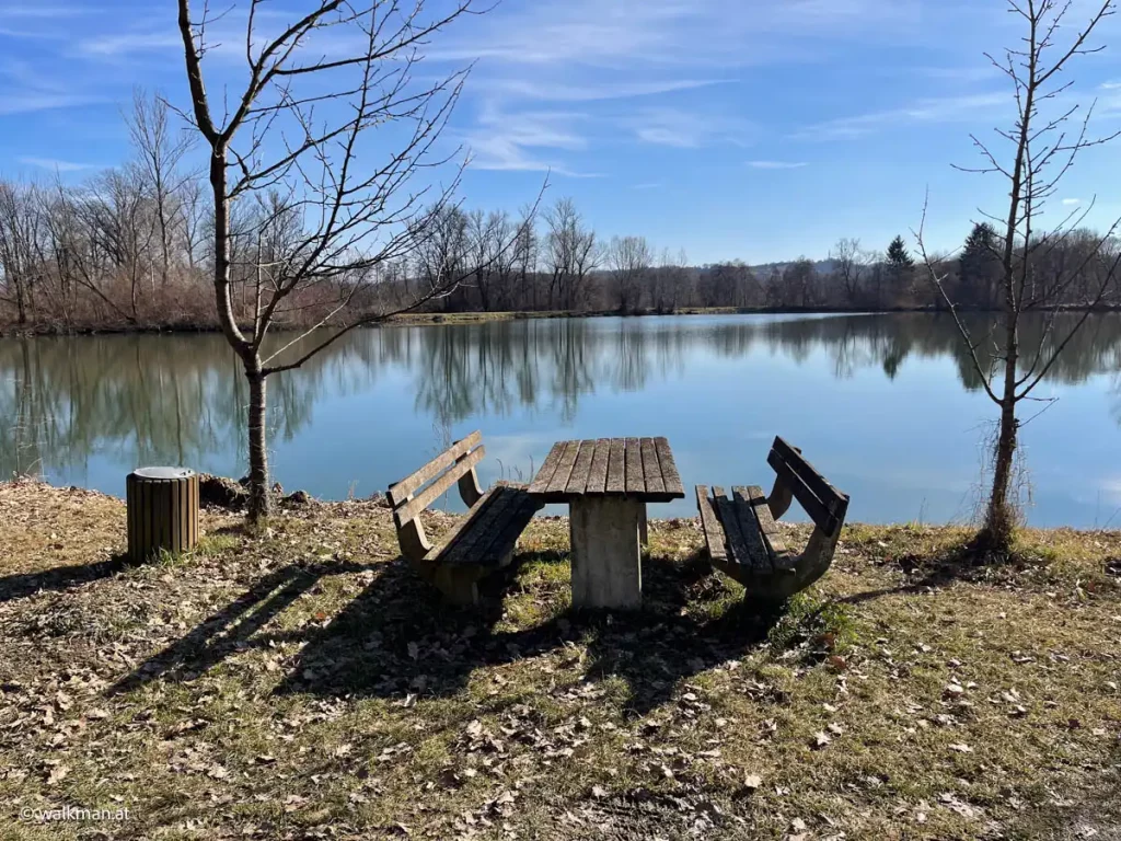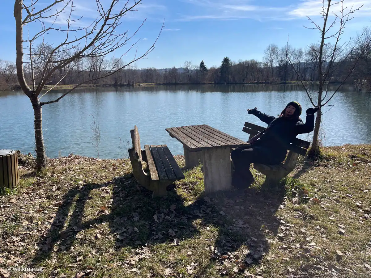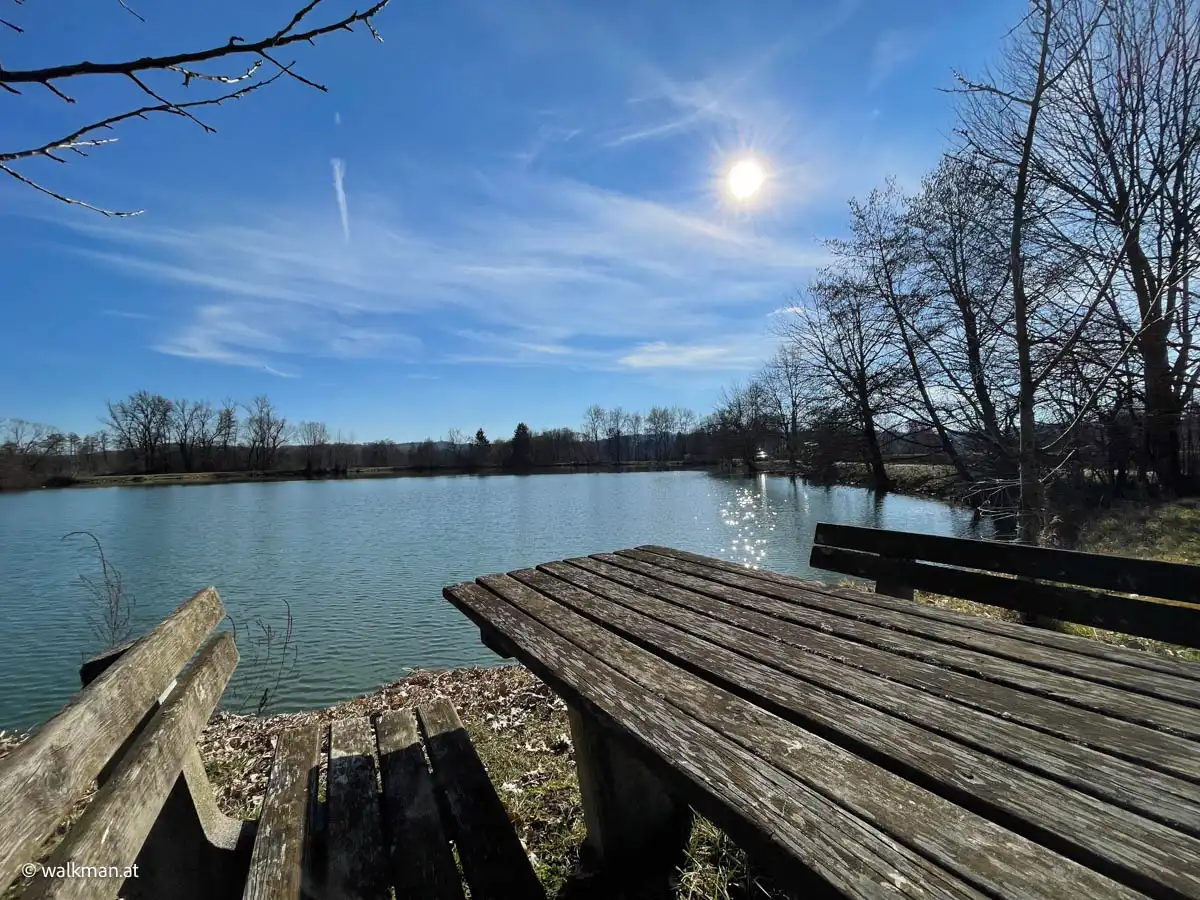 Also wieder raus aus dem Wald und weiter auf unserer Route. Und – unverhofft kommt oft – entdecken wir dann doch noch ein richtig schönes Highlight. Gleich nach dem Wald kommen wir an eine Wegkreuzung und hinter dieser ein richtig schmucker Fischteich. Samt Rastgelegenheit in Form eines Tisches mit Bänken.