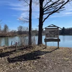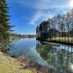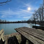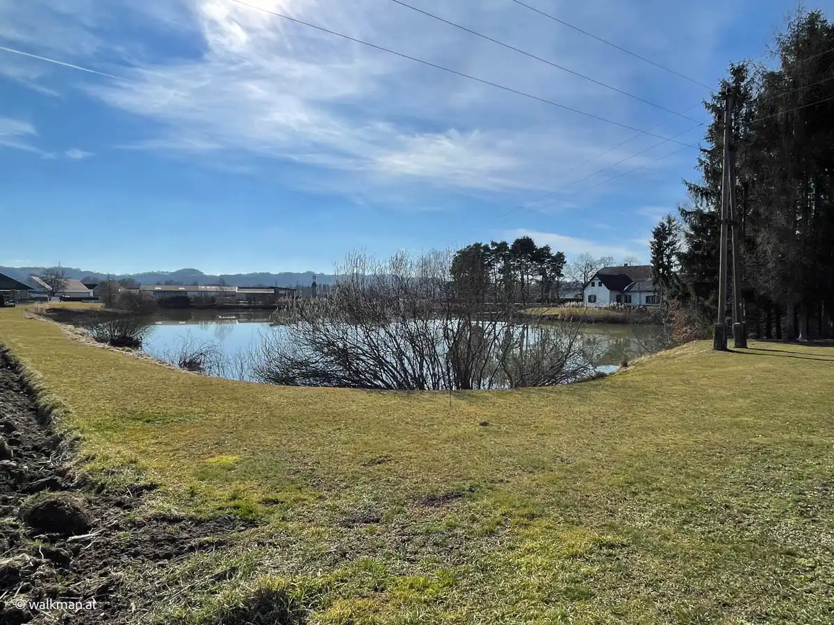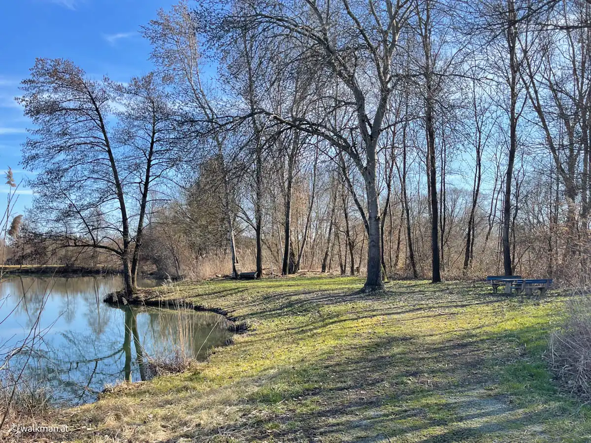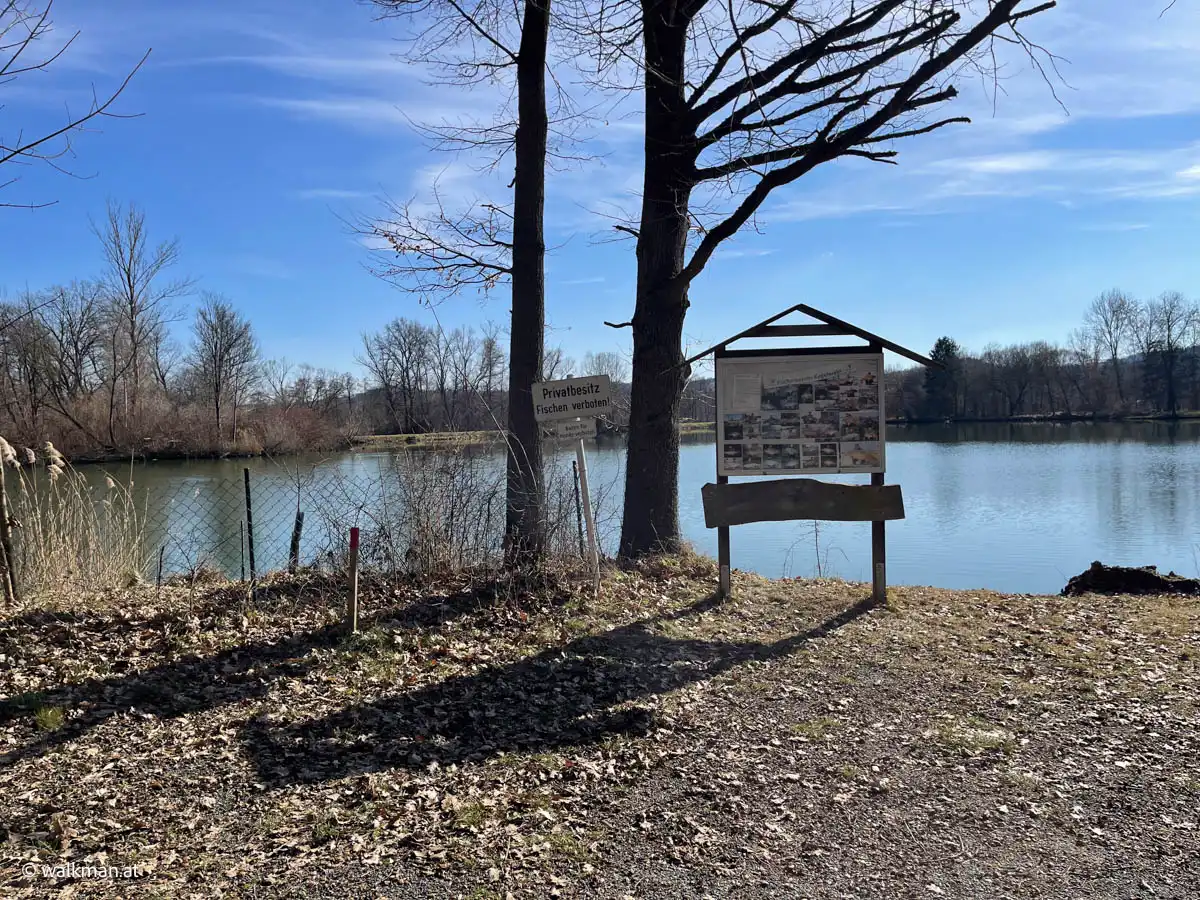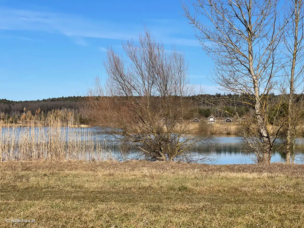 Also wieder raus aus dem Wald und weiter auf unserer Route. Und – unverhofft kommt oft – entdecken wir dann doch noch ein richtig schönes Highlight. Gleich nach dem Wald kommen wir an eine Wegkreuzung und hinter dieser ein richtig schmucker Fischteich. Samt Rastgelegenheit in Form eines Tisches mit Bänken.