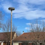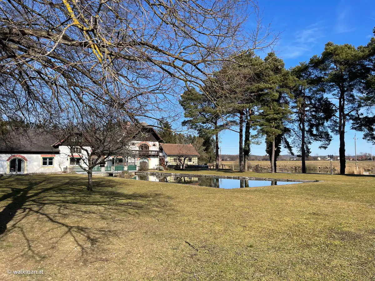 Gut gelaunt erreichen wir das Ende der Geraden. Hier entdecken wir links einen schmucken, aber privaten Fischteich. Ein Kuriosum hier ist sicher der Strommast mitten im Teich. Auf einem Betonsockel stehend. Na, wenn hier das Kabel reißt, braucht die Fische drinnen keiner mehr grillen. Nur mehr mit dem Kescher rausholen und genießen.