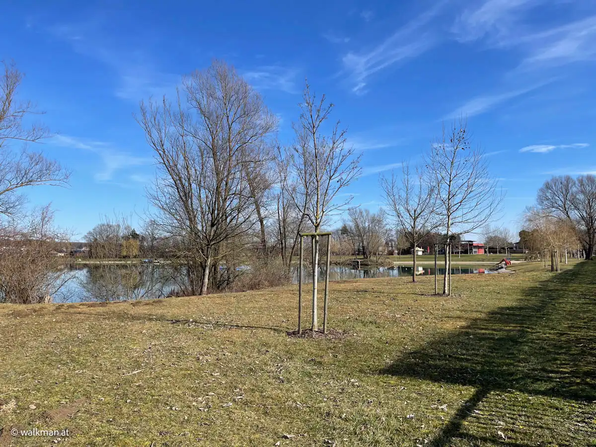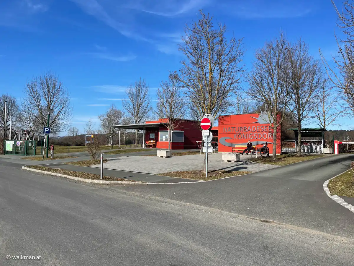 Nach dem Teich biegen wir links ab, ein kurzes Stück die Gasse nach vor und schon wieder nach rechts. Jetzt, auf der Seestraße angekommen spazieren wir beim Naturbadesee Königsdorf vorbei. Auch hier waren wir noch nie drinnen gewesen. Es scheint, als haben wir ja noch einiges nachzuholen. Der nächste Sommer kommt bestimmt.
