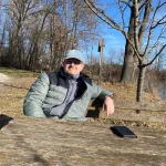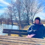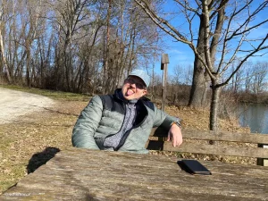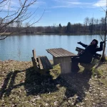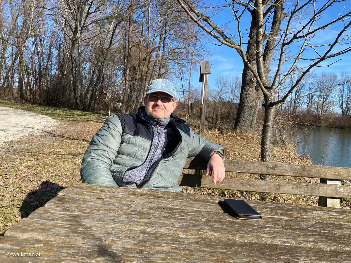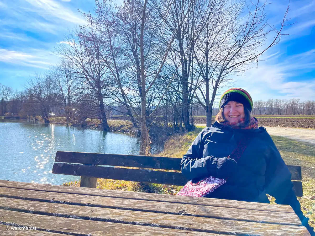 Jetzt machen wir beide einmal eine kleine Pause vom Wandern und genießen den schönen Teich. Und die wärmenden Sonnenstrahlen. Ja, hier gefällt es uns. Ein quasi Geheimtipp. Und rätseln weiterhin, wen die hübsche Blondine wohl an der Strippe hatte. „Leute ausrichten“ heißt das, glaube ich, im Volksmund. Darf auch mal sein und macht Spaß. Kommt ja niemand zu Schaden dabei.