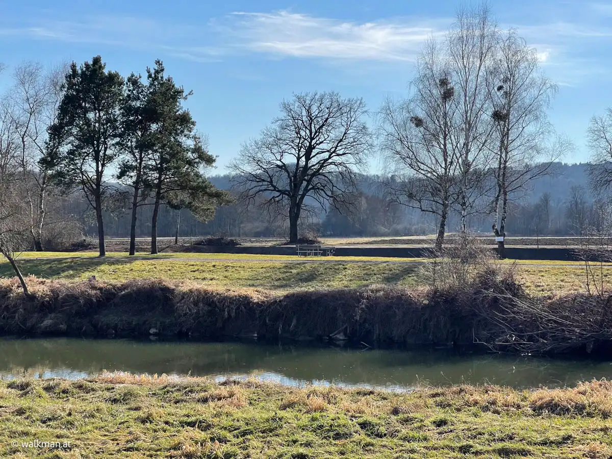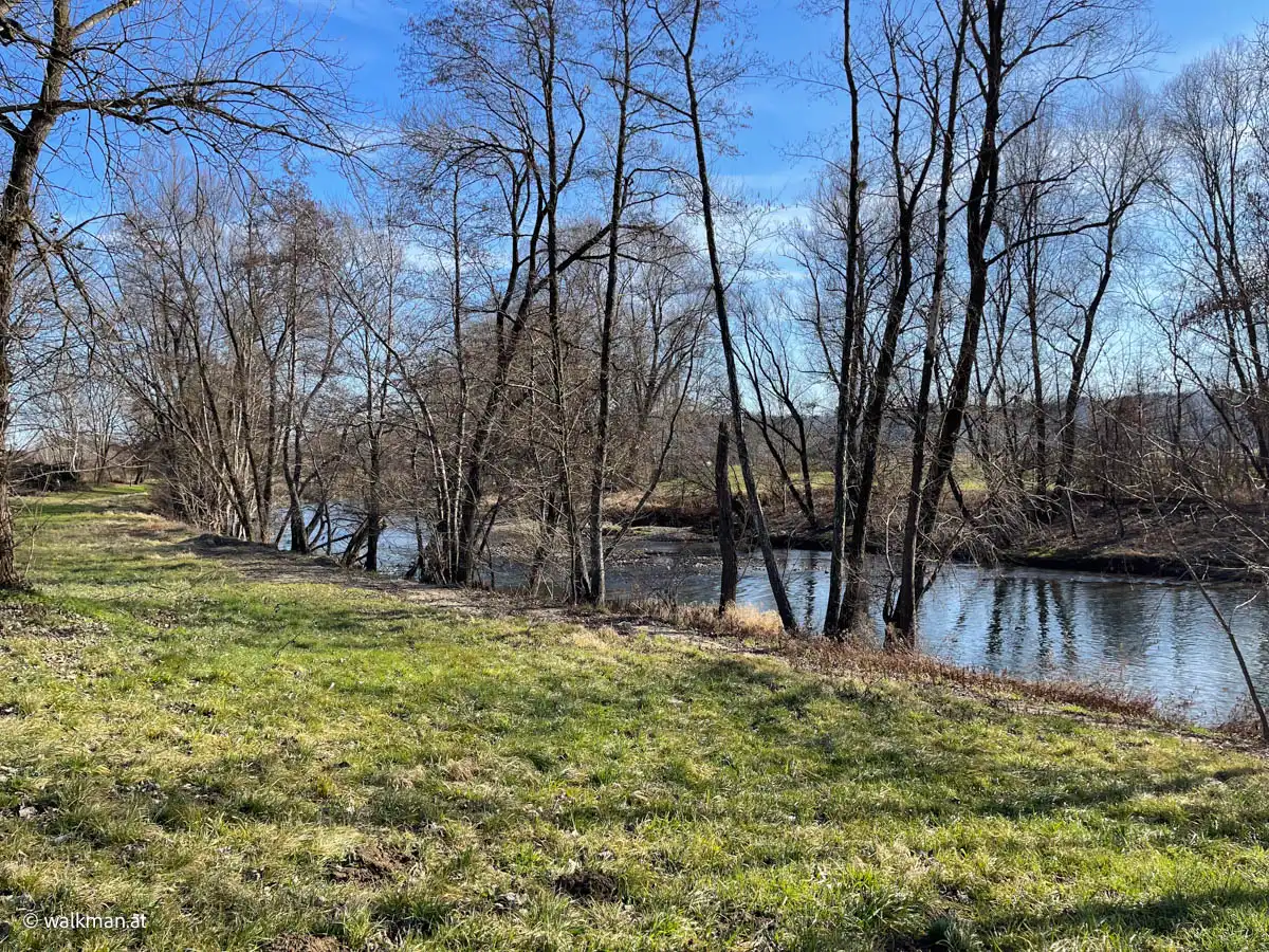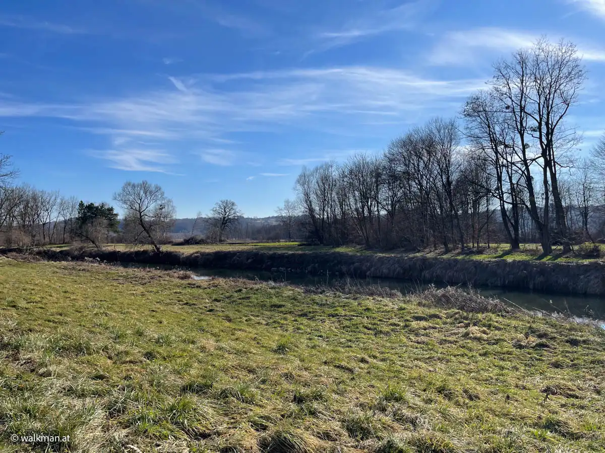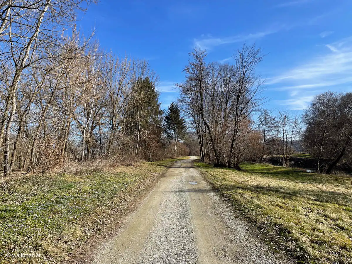 Der Weg ist hier weiterhin angenehm zu gehen. Ein fester Feldweg. Zu unserer Rechten plätschert hier die Lafnitz dahin und begleitet uns ein Stück weit. Ihr langsam fließendes Wasser glitzert in der Sonne. Und am Ufer entdecken wir auch schon die ersten Frühlingsboten in Form von Primeln und Krokussen. Herrlich.