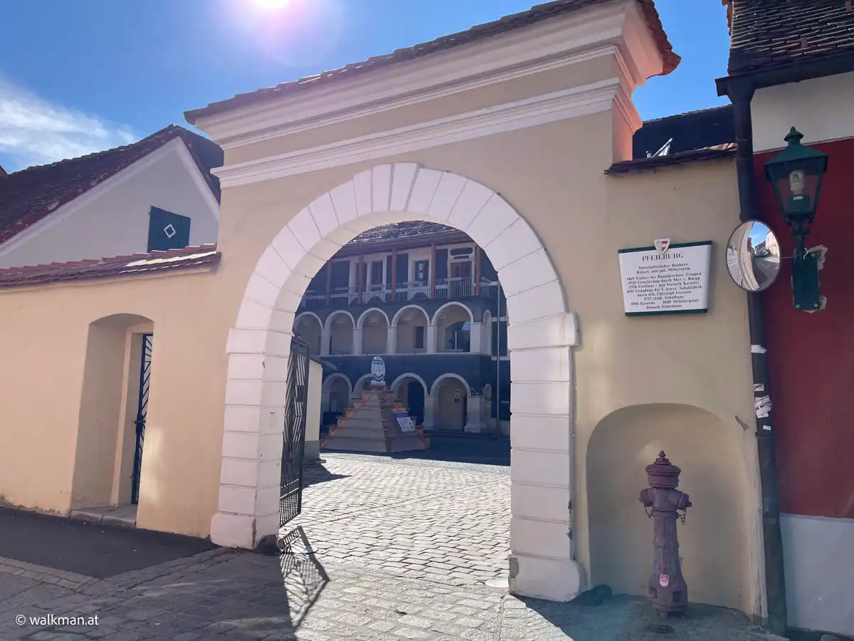 Hier komme ich nun an der çPfeilburg“ vorbei. Auch von dieser habe ich schon viel gehört, aber noch nie besucht. Obwohl sie bereits einmal Teil einer Tourplanung war, bei der wir dann doch umdisponiert hatten. Ich nehme mir vor das gemeinsam mit Manuela im Laufe des Jahres unbedingt nachzuholen. Am besten im Sommer, im Zuge einer Stadtwanderung. Wenn die Eiscafés offen haben.