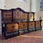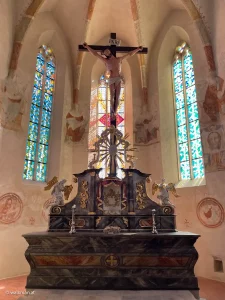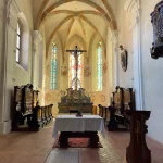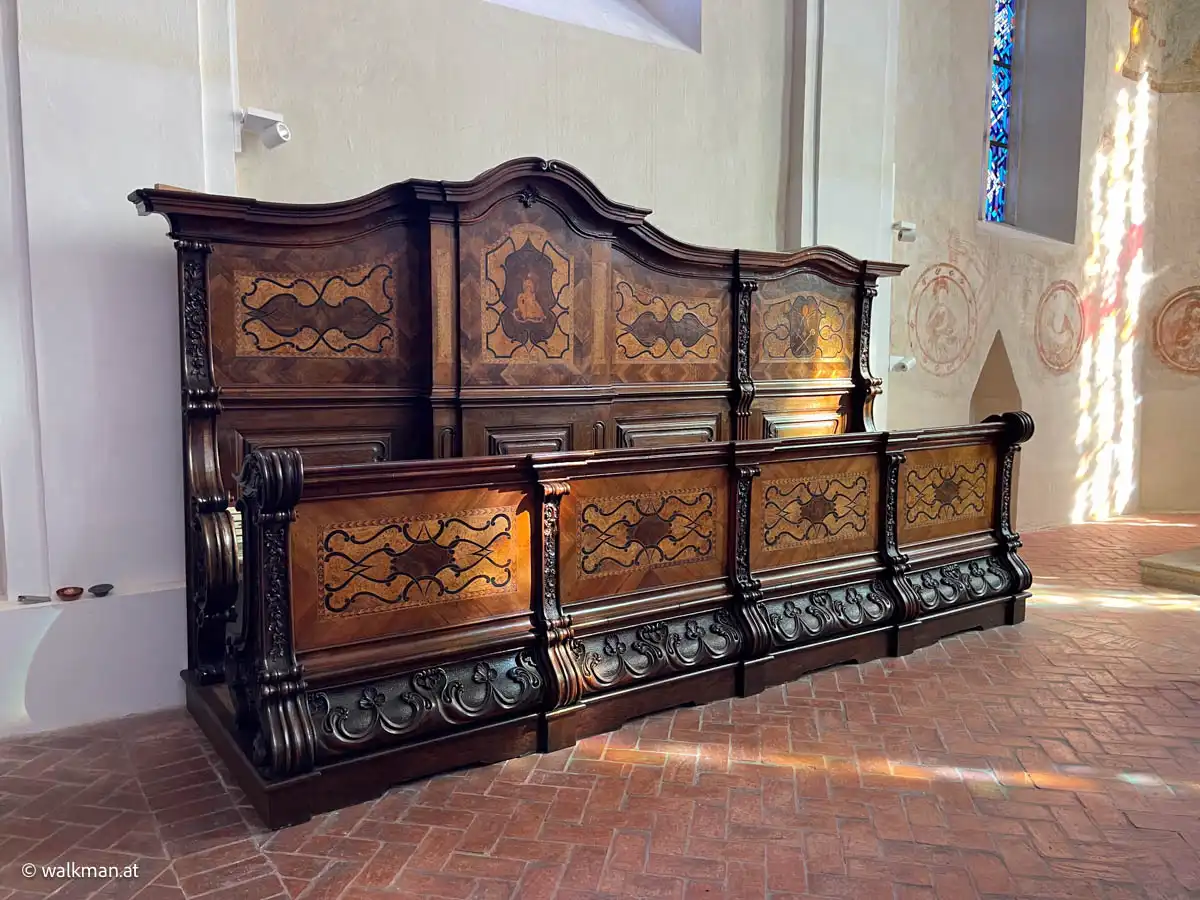 Am Anfang des Bereiches steht ein schlichter Altar, mit weissem Tuch überzogen. Dahinter links- und rechtsseitig zwei Bänke, die wie Geschworenen-Bänke in einem Gerichtssaal wirken. Das habe ich auch noch nie so in einer Kirche gesehen. Und wiederum dahinter ein mächtiges Kreuz auf einem massiven Marmorsockel.