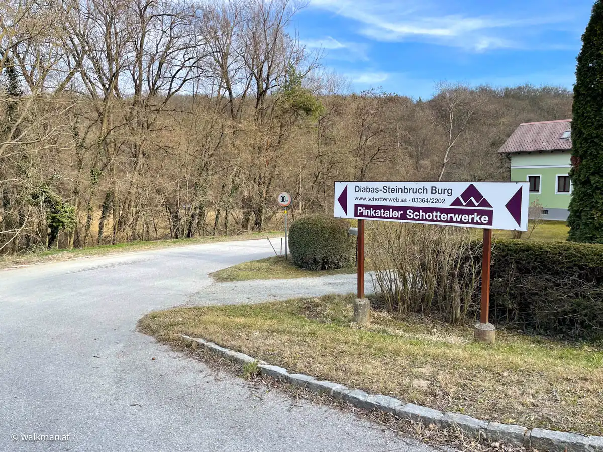 Zunächst auf die Bundesstraße hinaus und an dieser ein kleines Stück weit bergab, um bereits bei der nächsten Gelegenheit wieder rechts hinein zu wandern. „Pinkataler Schotterwerke“ verkündet hier ein Schild, wohin diese Straße führt. Und genau dort wollte ich hin.
