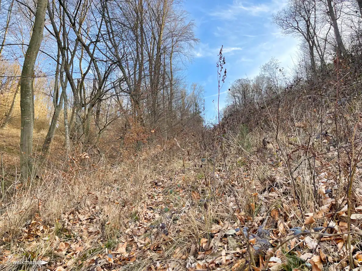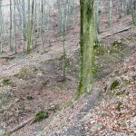 Der Aufstieg selbst erfolgt jetzt Schritt für Schritt. Und vor allem hochkonzentriert. Die Bodenbeschaffenheit ist hier ziemlich lose. Waldboden mit Blättern bedeckt und viele vereinzelte lose Steine. Die ob des Gefälles jederzeit rutschen können. Auf diese drauf steigen oder gar als Abstützung benutzen? Absolut verboten. Viel zu hoch ist die Gefahr eines Abrutschens. Und wer hier mal ins Rutschen kommt, ist schwer aufzuhalten. In der Schneise selbst stehen ja keine Bäume. Nur am Rand.