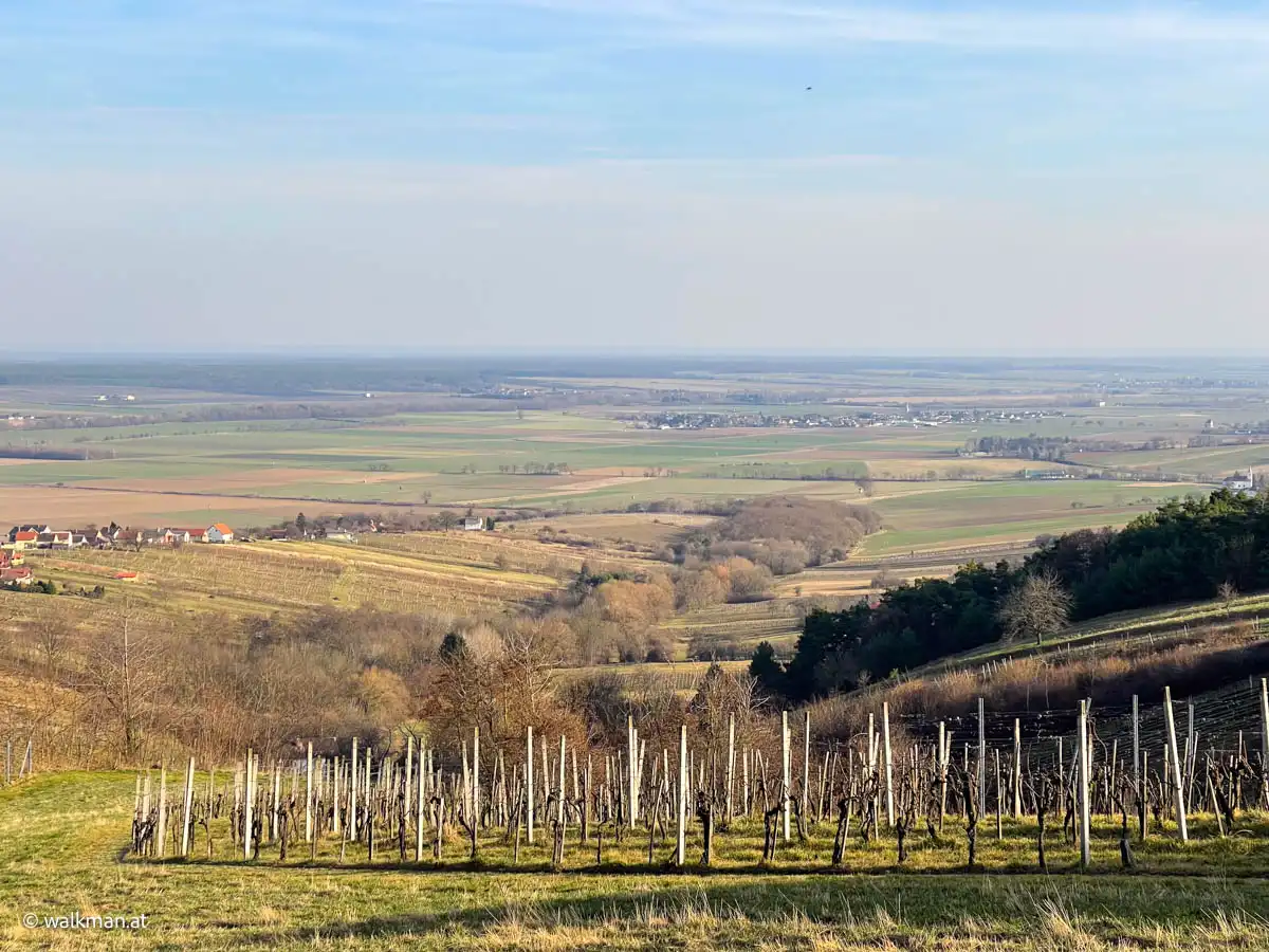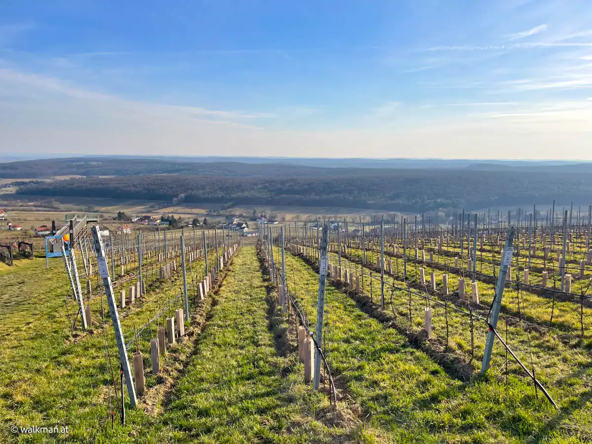 Nein, das ist nichts Alltägliches. Das ist wunderschön. Jedes Mal aufs Neue. Das Panorama von hier oben ins Stremtal hinunter ist bombastisch. Aber nicht nur das. Über das Stremtal hinaus bis weit in die panonnische Tiefebene nach Ungarn hinein geht der Blick hier. Manche behaupten sogar, an besonders schönen Tagen könne man bis zum Balaton sehen. Bestätigen kann ich das selber nicht, aber halte ich es für möglich? Eindeutig ja.