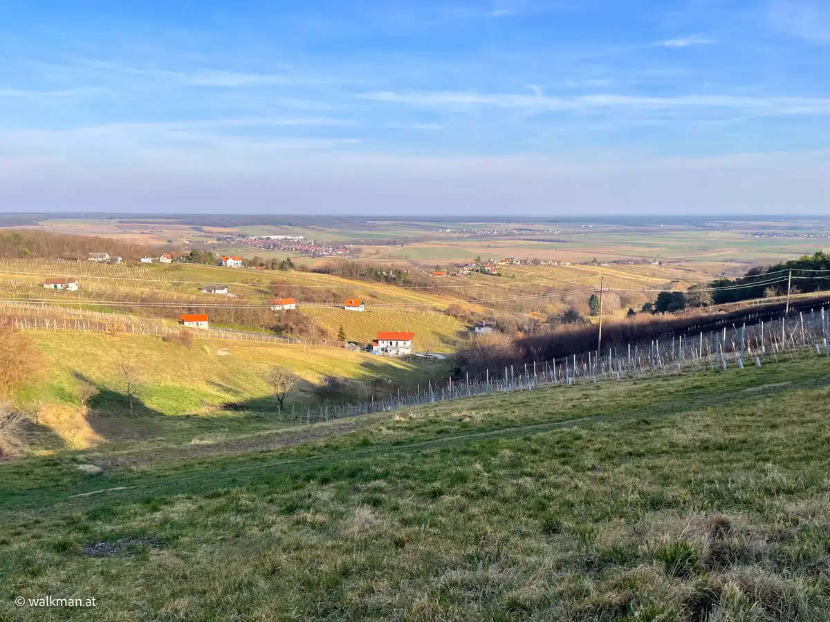 Für mich, als Bewohner der Gegend, ist das eher etwas Alltägliches. Aber deswegen nicht weniger schön. Im Gegenteil. Jetzt gerade, als ich nach einer Rechtskurve, abermals zwischen Kellerbauten hindurch, ein wenig bergauf wandere, macht zu meiner Linken, nach einem Kellerstöckl, das Tal so richtig auf.