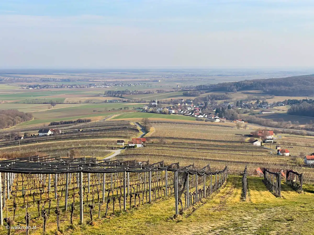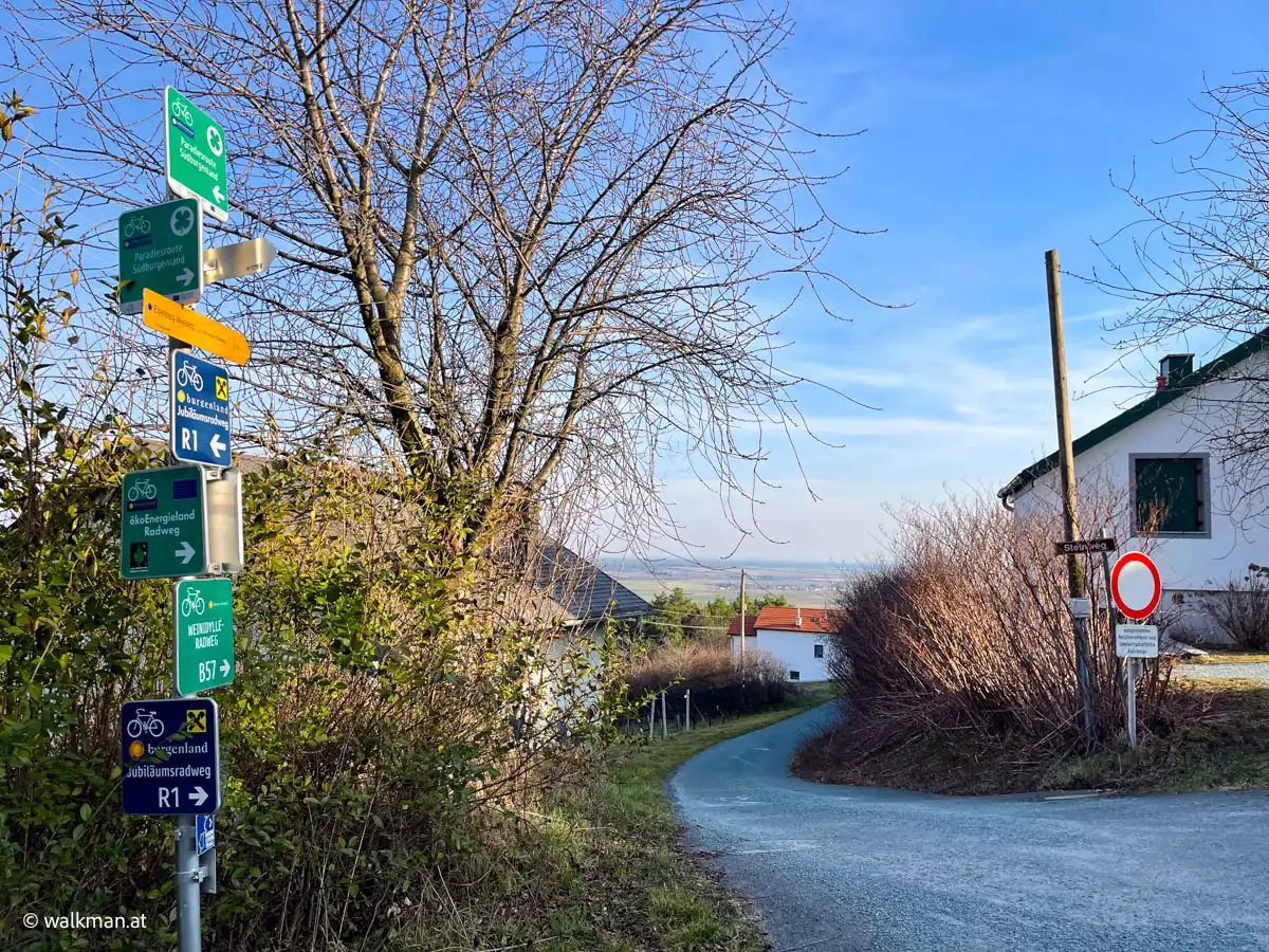 An vielen Kellerstöckeln vorbei, die hier das Ortsbild prägen, marschiere ich von Minute zu Minute, von der Strapazen erholter, auf meiner Wanderung weiter. Verschiedene Namensschilder auf den Häusern bekunden auch die verschiedenen Weinbaubetriebe, die hier den edlen Tropfen an die Kundschaft verkaufen. Mal mit reinem Verkauf, mal mit einem Buschenschank dabei. Beides mit schöner Aussicht.