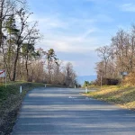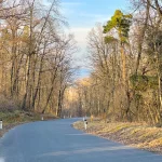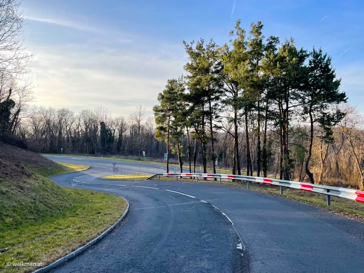 Hier, an der Weggabelung halte ich mich nun rechts und wandere bergab aus dem Ort hinaus. Die Ortstafel hinter mich lassend führt meine Route nun auf einer asphaltierten, geschwungenen Straße durch den Wald am Eisenberg. So abwechslungsreich wie die vorherigen Abschnitte waren, so einfach ist nun der aktuelle. Eine unspektakuläre Waldstraße ins Tal.