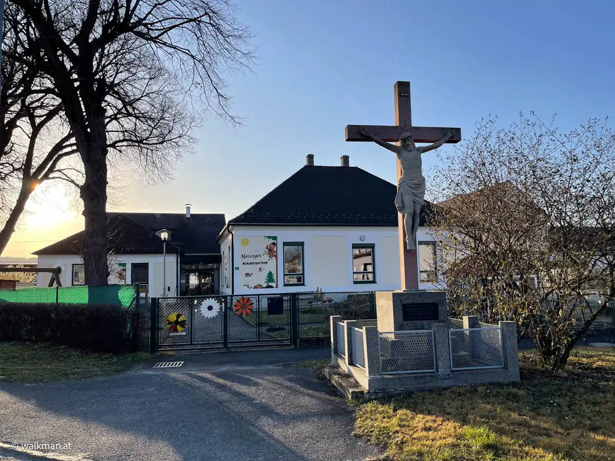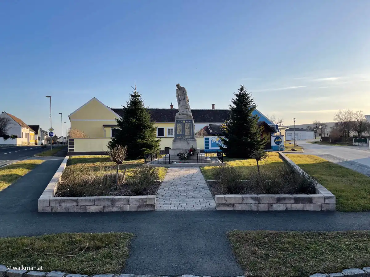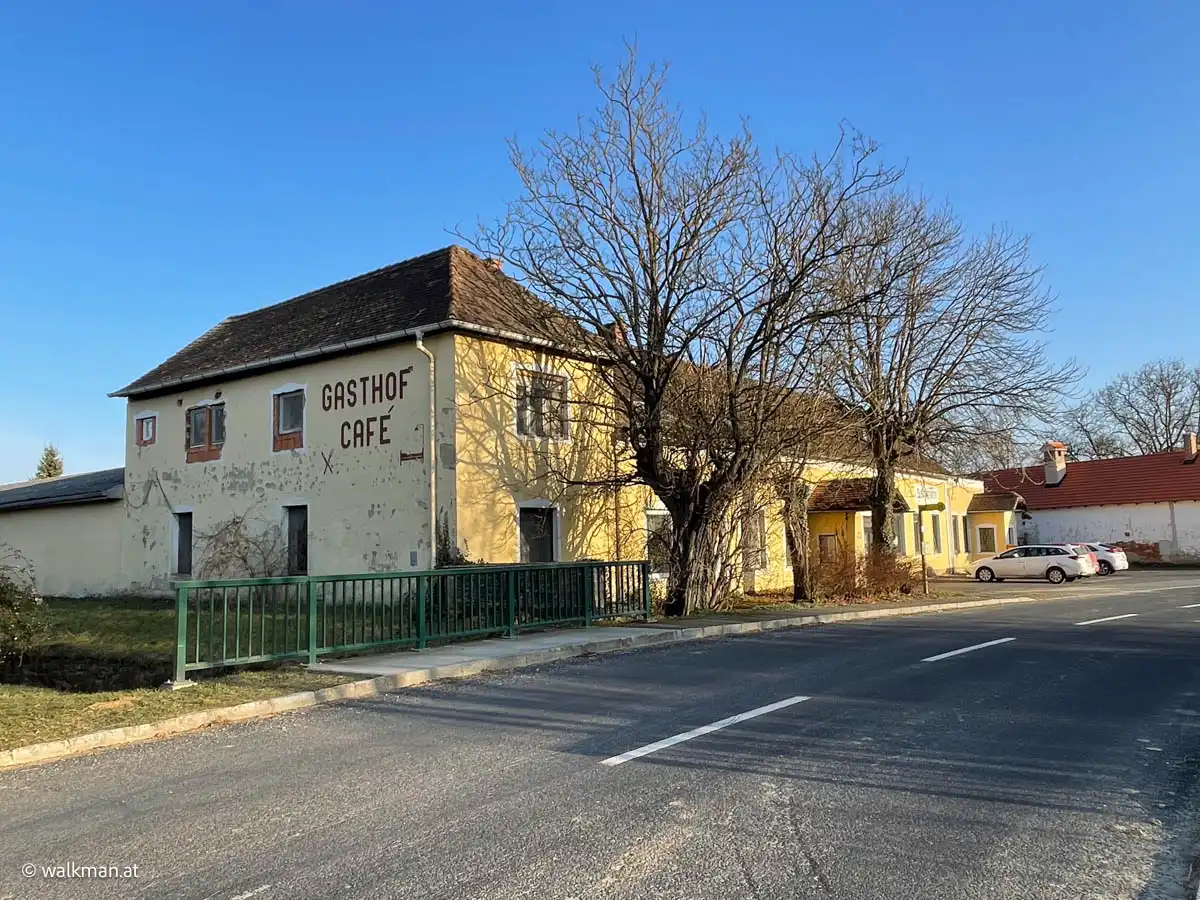 Nach insgesamt 1 Stunde und 46 Minuten Wegzeit wanderte ich dann endlich in den Ort und zu den windschützenden Häusern hinein. Vorbei an der Ortstafel, an einem aufgelassenen Gasthaus und der Kreuzung mit dem Kriegerdenkmal und dem Kindergarten. Ein Foto hier, ein Foto da. Jetzt machte meine Tour wieder Spaß.