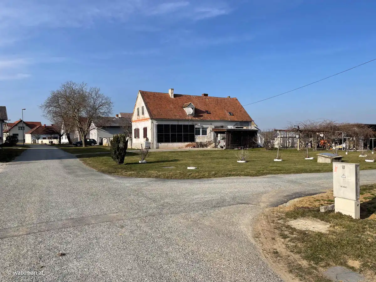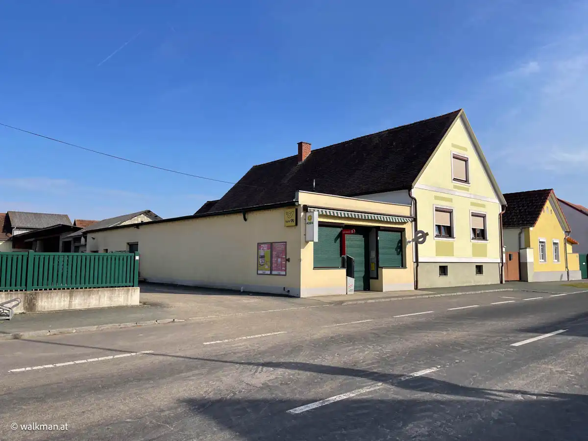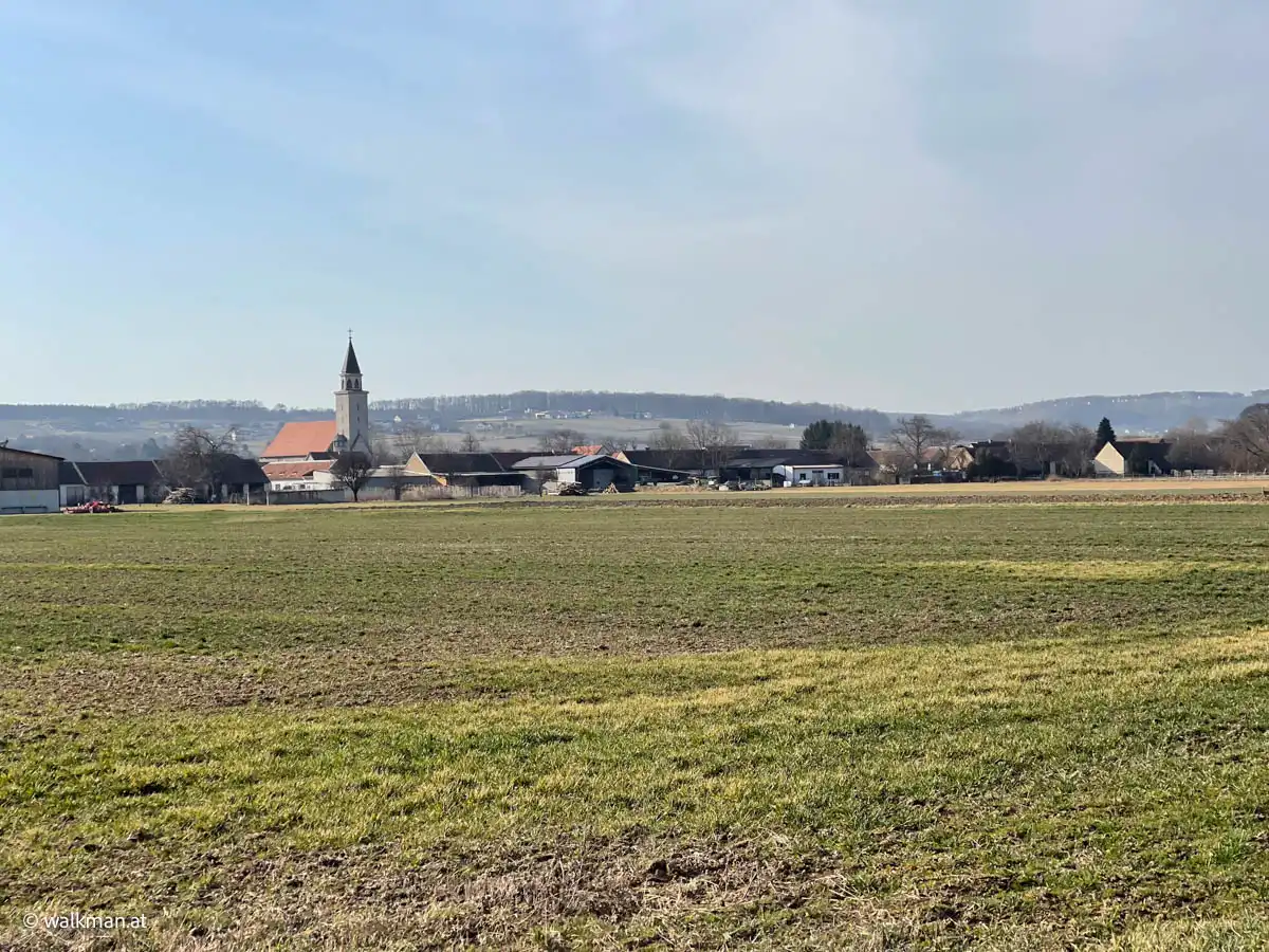 Nach insgesamt 1 Stunde und 46 Minuten Wegzeit wanderte ich dann endlich in den Ort und zu den windschützenden Häusern hinein. Vorbei an der Ortstafel, an einem aufgelassenen Gasthaus und der Kreuzung mit dem Kriegerdenkmal und dem Kindergarten. Ein Foto hier, ein Foto da. Jetzt machte meine Tour wieder Spaß.