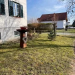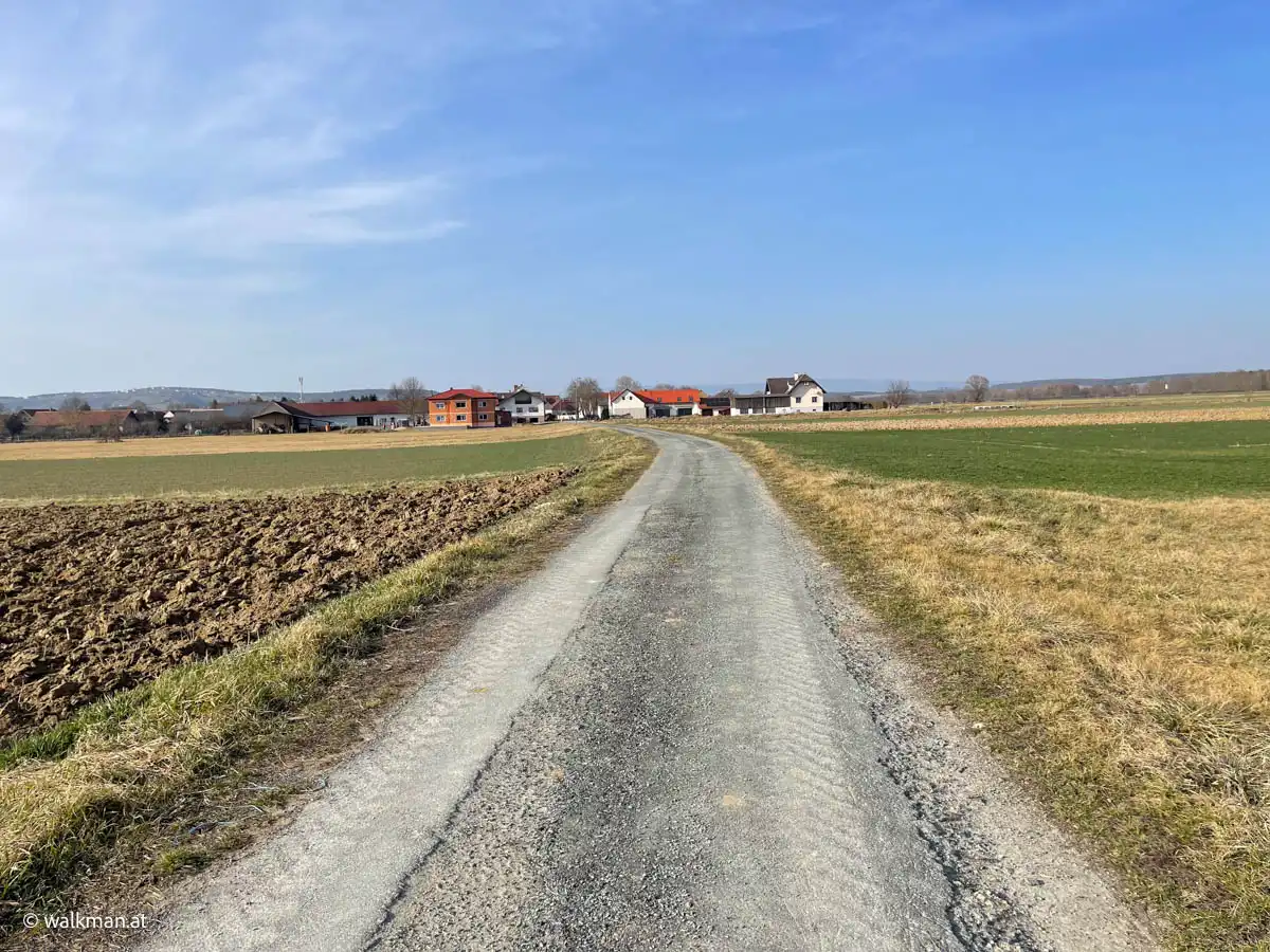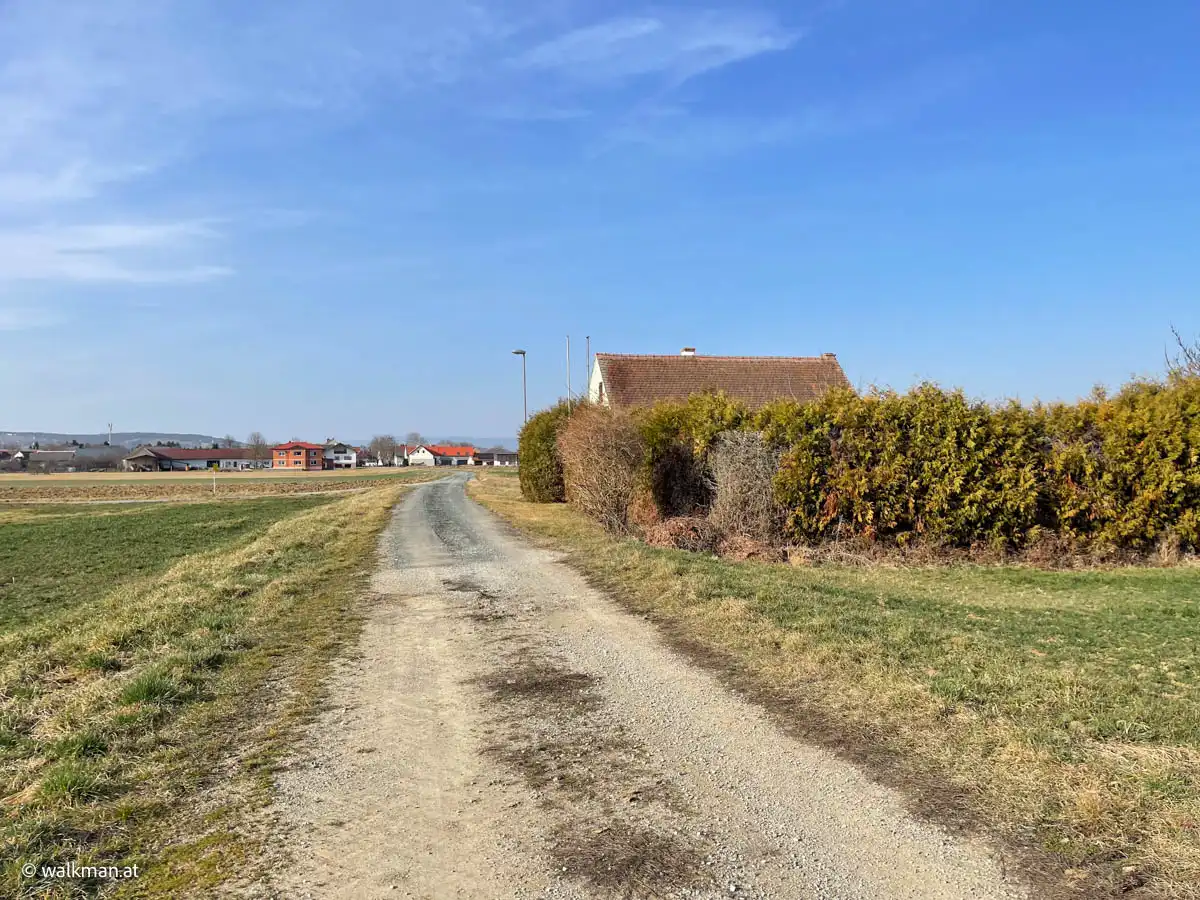 Aber auch diesem Umstand hatte ich Sorge getragen und meine Marschrichtung zunächst ein kurzes Stück gegen den leichten Wind, der heute wehte, nach Süden ausgelegt. So wanderte ich zunächst an der Hauptstraße, an schmucken Häusern entlang, Richtung Ortsende. Etwa 100 Meter vor der Ortstafel sollte eine Gasse links hinein führen.