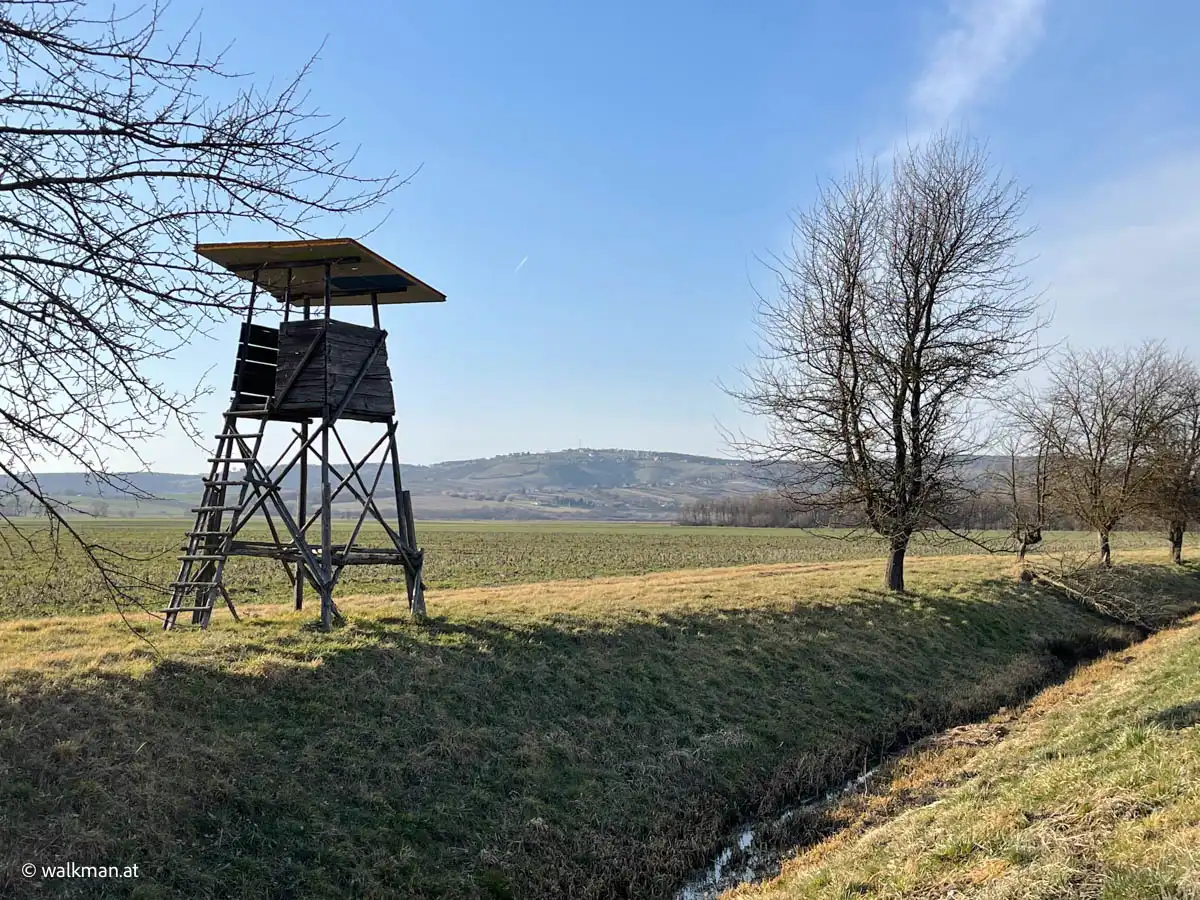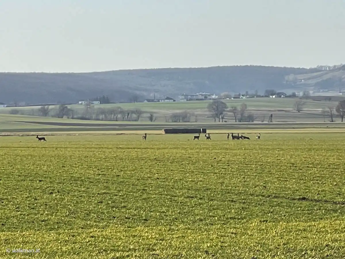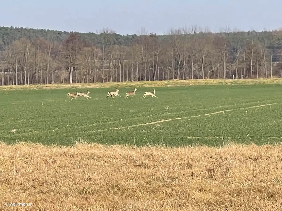 Links kann ich die schönen Weinberge von Deutsch Schützen sehen. Geradeaus nach Norden, erhebt sich der Eisenberg über die Häuser des Ortes hinweg. Dazwischen sticht der markante Kirchturm des Ortes, zwischen den Häusern hervor. Rechts gibt es nicht viel zu sehen, als flaches Land und die Gebüschgürtel an der Staatsgrenze. Und immer wieder Rehe.