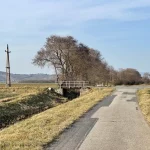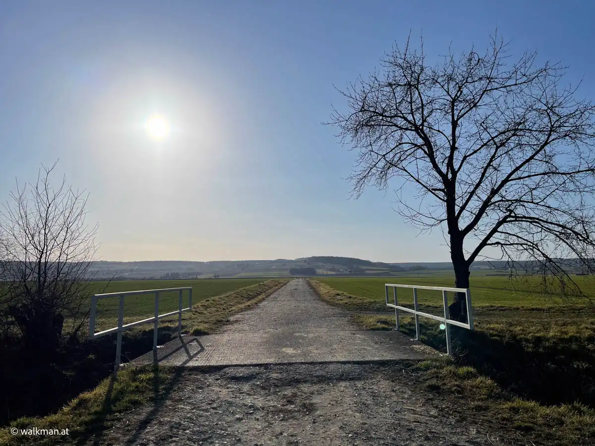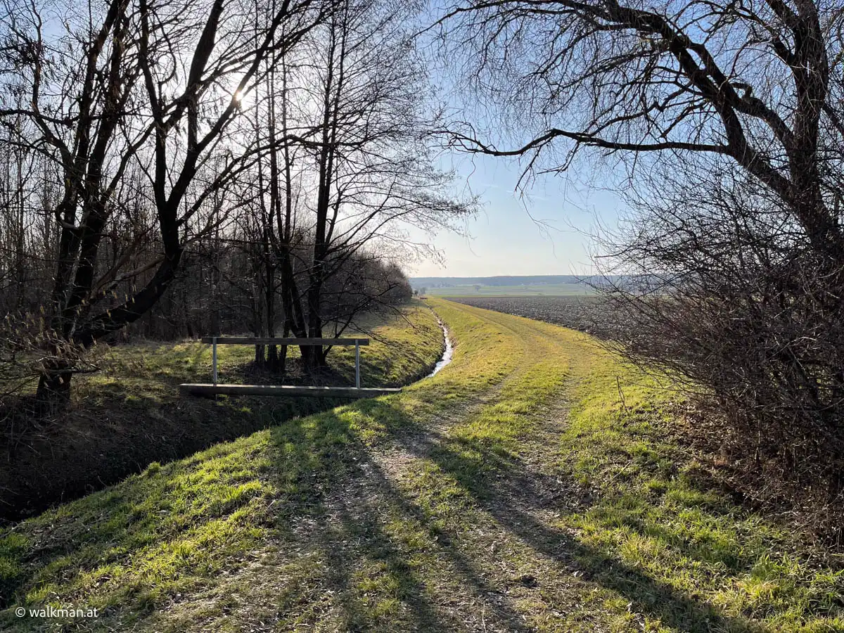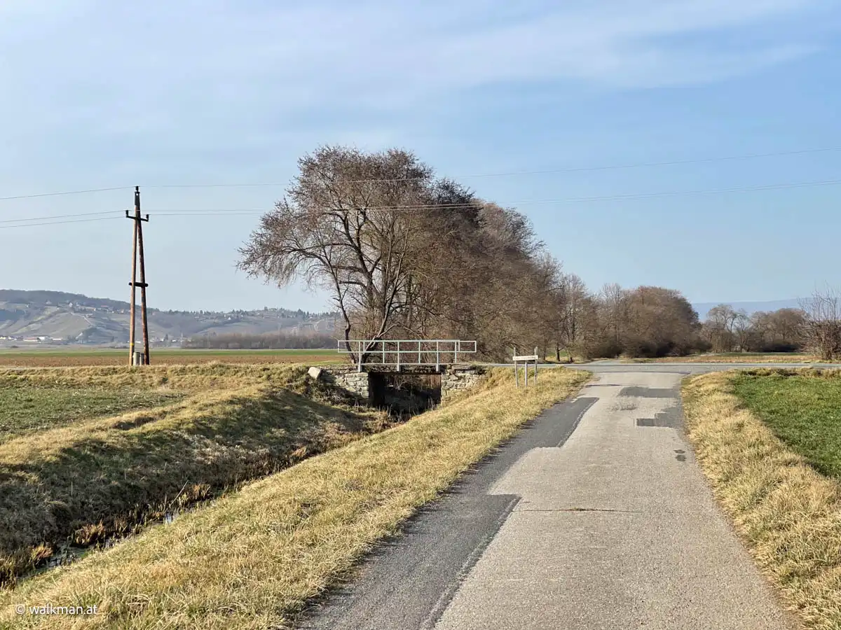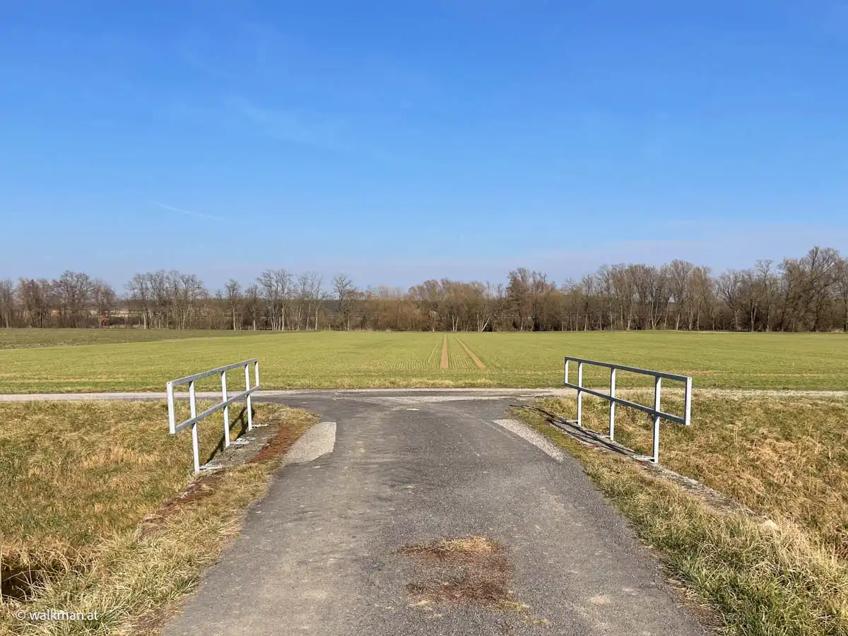 Diese geradlinige Überland-Wanderung wird dann nur kurz von einem Intermezzo mit einem paar Häusern des Ortes und einer Links-rechts-Kombination samt Brücke unterbrochen. Nach dieser geht es wieder wie gehabt weiter. Geradeaus nach Norden. Heute, bei meiner Tour, mit dem leichten Südwind im Rücken. Ok, leicht ist er nun nicht mehr. Er scheint an Stärke zuzunehmen. Wieder kein Glück.