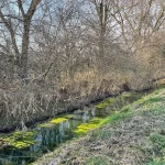 Die Richtung stimmte und in etwas Entfernung konnte ich auch eine Reihe an Bäumen entdecken, die zwei Ursachen haben können. Entweder verläuft neben ihnen mein gewünschter Anschlussweg oder ein Bach bzw. Entwässerungskanal. Was natürlich nicht mein Wunsch war.
