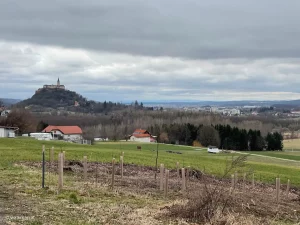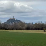 Also durch den Ort durch, entlang unserer Route. Ein wenig außerhalb des Ortes finden wir dann eine Möglichkeit, bei einem Holzlagerplatz. Hier stören wir niemanden und es ist genug Platz für das Holz und unser Vehikel. Von hier aus haben wir auch gleich eine schöne Aussicht auf die Burg. Na bitte, wer sagts denn.