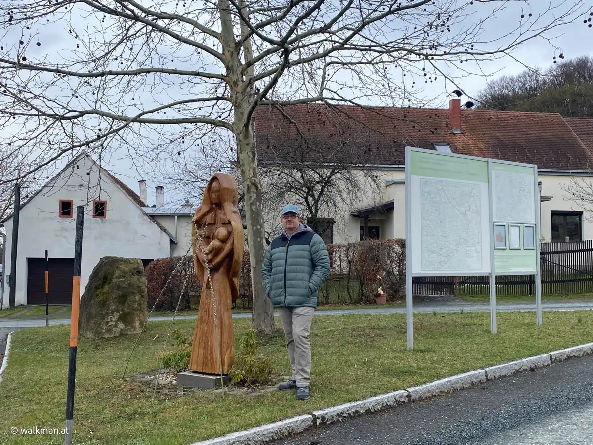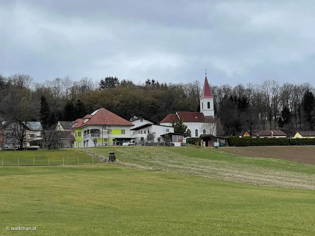 Vorbei an der Wohnsiedlung, an den Häusern von Güssing und an der Ortstafel, die mir verkündete, dass ich mich wieder im Ortsgebiet von St. Nikolaus befand. Kurze zeit später an der Kirche und dem Kriegerdenkmal vorbei. Hier schnell ein paar Fotos fürs Album schießend, ohne lange stehen zu bleiben.