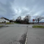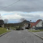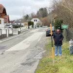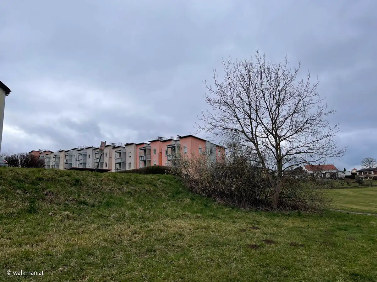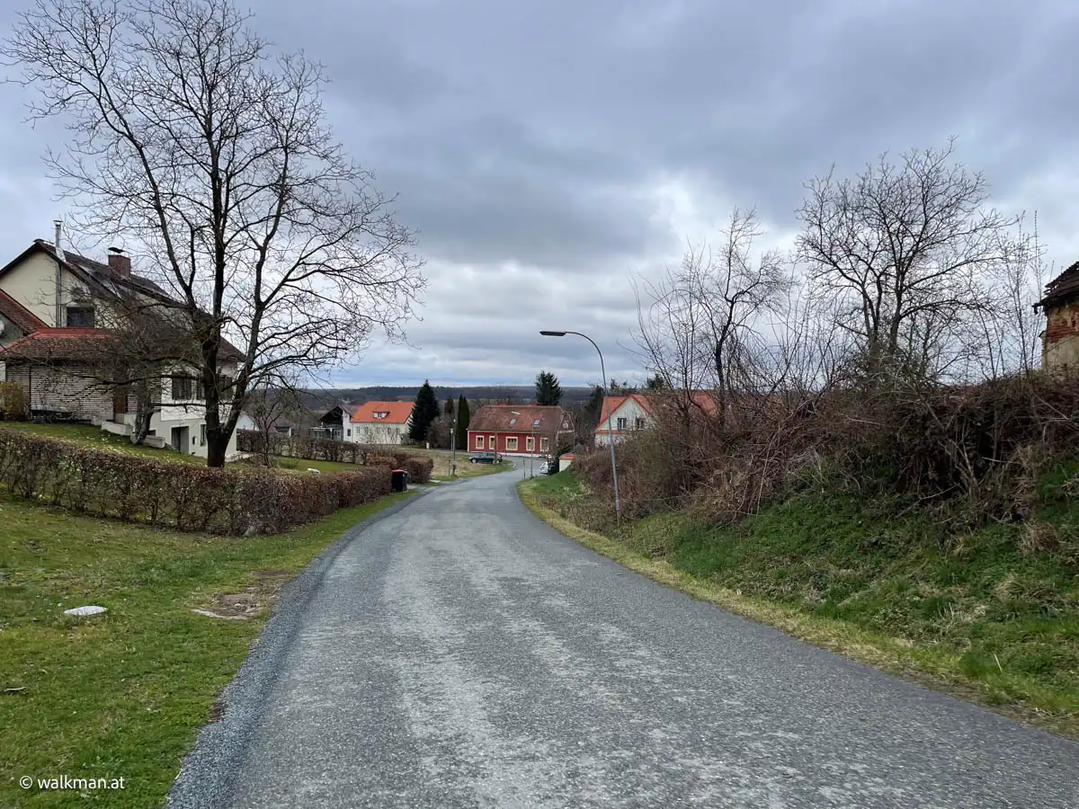 Ah, hier nun links hinauf. Der Weg vor mir beschrieb eine gatschige Schleife nach links oben, um danach in die Wohnstraße der Siedlung zu münden. Nun hatte ich wieder eine exakte Standortbestimmung. Vorsichtig bergauf über glitschigen Gatsch schaffte ich es, ohne mich „auf den Popsch zu setzen“, zur Straße.