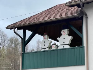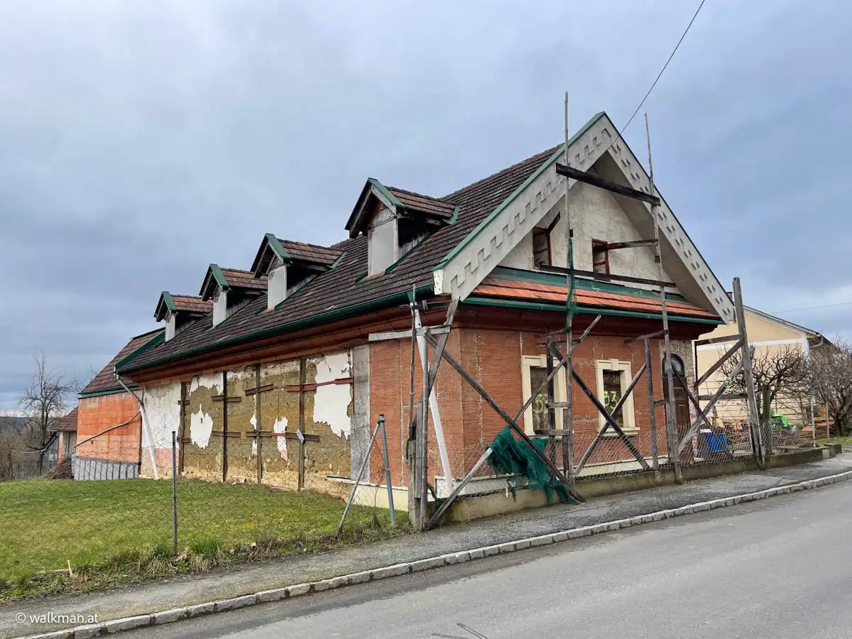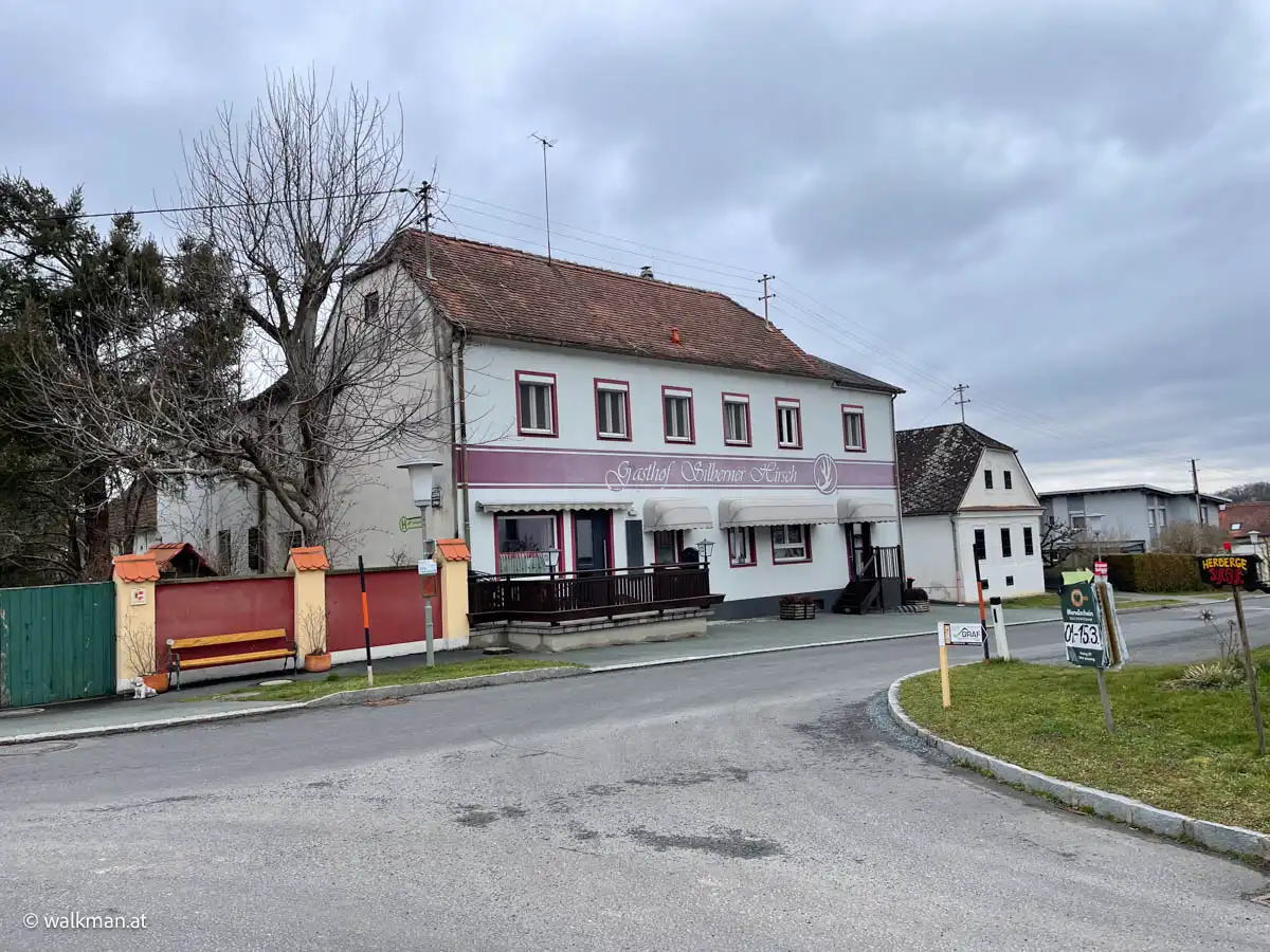 Weiter geht es bei uns die Gasse zur Hauptstraße hinab. Hier, beim Gasthof „Silberner Hirsch“ müssen wir links abbiegen. Das Wirtshaus selbst wirkt wie ein typischer Dorfgasthof. Die verblichene, blassrosa Farbe an der Fassade lässt uns aber rätseln. Hat er noch offen? Oder schon für immer zu? Das werden wir noch erkunden. Heute jedenfalls, hat er zu.