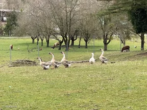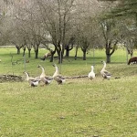 An der Bundesstraße entlang, Richtung Güssing spazieren wir aus dem Ort hinaus. Eine Schar Gänse erregt unsere Aufmerksamkeit. Aber dem plötzlich einsetzenden Schnattern nach zu urteilen dürfte es eher umgekehrt gewesen sein. So ganz sind wir ihnen nicht „koscher“, wie wir hier mit unseren Handys stehen und Fotos von ihnen machen. Sie ergreifen auch gleich die Flucht in einen hinteren Bereich des Gartens. Unser Hinweis „Chillax!“, fruchtet auch nicht. Wir können halt kein „gänsisch“.