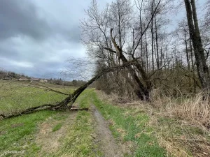 Durchtränkt von Lacken und kleineren Seen und mit kreuz und quer wachsenden Bäumen. Einige davon vom letzten Unwetter geknickt. Ein bizarr-schönes Bild, wie es nur die wilde, freie Natur gestalten kann. Vor mir hatte sich ein Baum über meinen Weg gelegt. Aber netterweise nicht ganz am Boden.