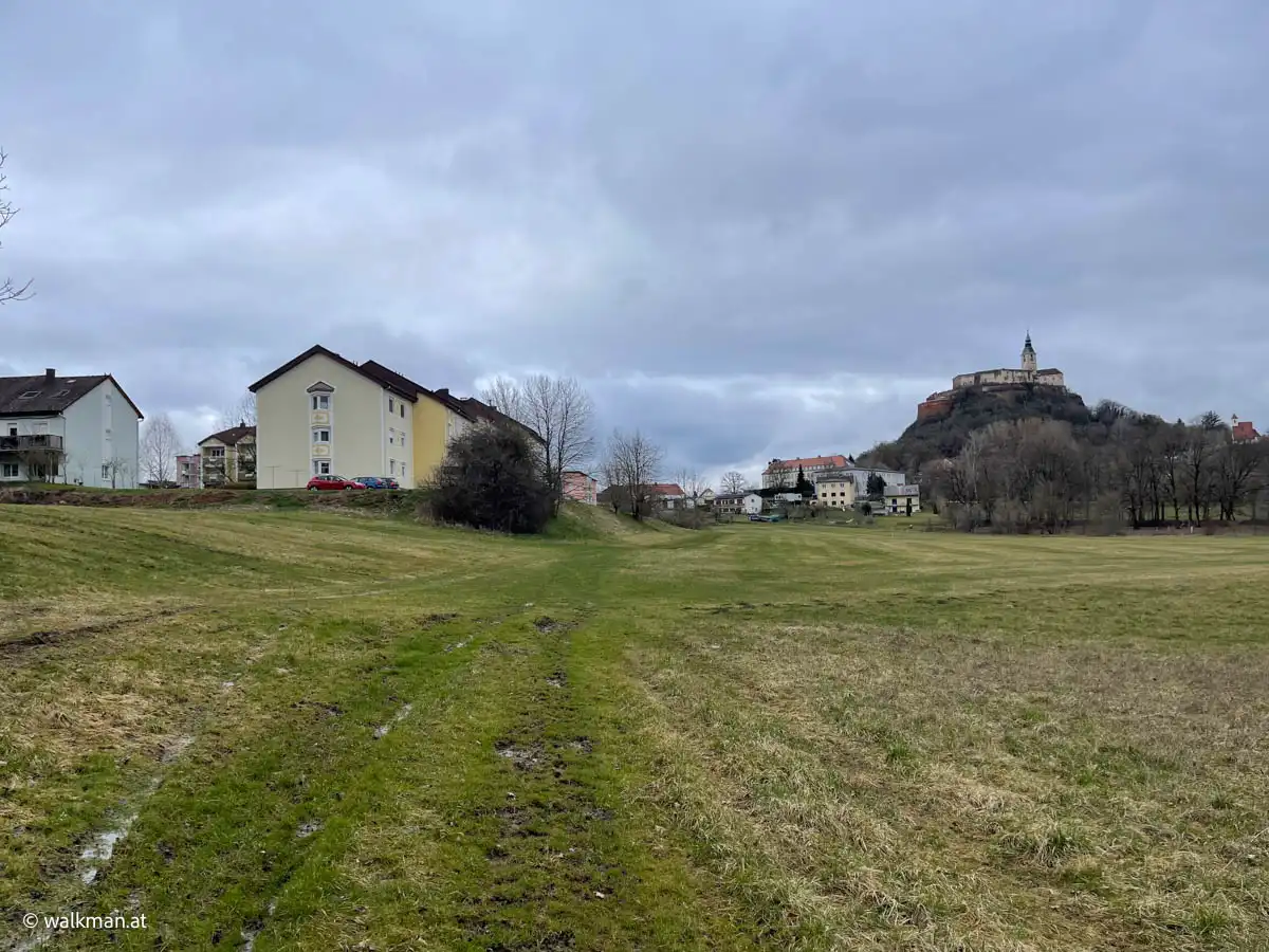 Also weiter dem Wegverlauf folgen. Die Burg Güssing thronte nun schon nahe über mir. Ich war also mittlerweile durch ganz St. Nikolaus durch und im Stadtgebiet von Güssing selbst angekommen. Diesem Umstand Tribut zollend beschleunigte ich meine Schritte, so gut es ging, auf dem feuchten Wiesenweg hier um Manuelas Wartezeit zu verkürzen und nicht zu viel schlechtes Gewissen zu bekommen.