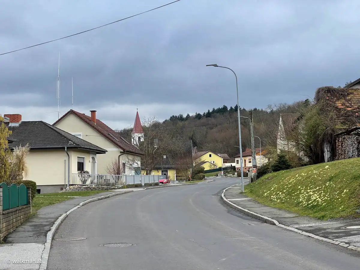 Unser gewählter Weg führt uns den alten Güterweg entlang, halbhoch am Hügel zwischen den beiden Orten entlang. Von hier aus hat man einen schönen Blick über das darunter liegende Stremtal. Bzw. hätte man. Am heutigen verregneten Tag ist die Aussicht eher bescheiden. Aber zumindest geht’s bei uns flott dahin.