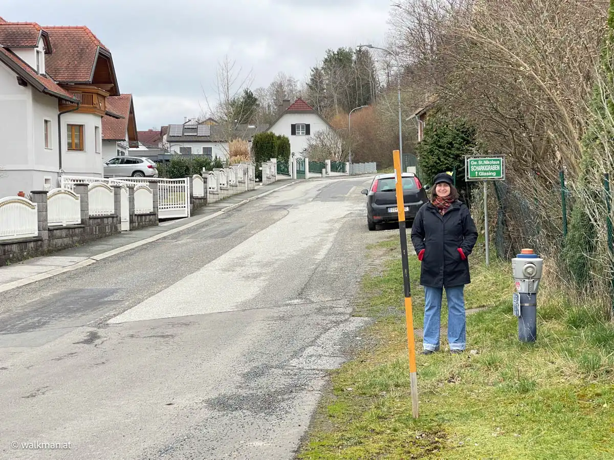 Unsere Route führt uns heute durch St. Nikolaus nach Glasing und retour. Und schon beim Parkplatz suchen hatten wir ein kleines Problem. Hier sind keine Parkplätze. Bei der Wohnsiedlung, gleich an der Ortseinfahrt findet man zwar einige, aber hier läuft man Gefahr, als Nichtbewohner, eine Anzeige zu erhalten. Also keine gute Idee. Die Bushaltestelle gleich danach ist da auch um nichts besser.