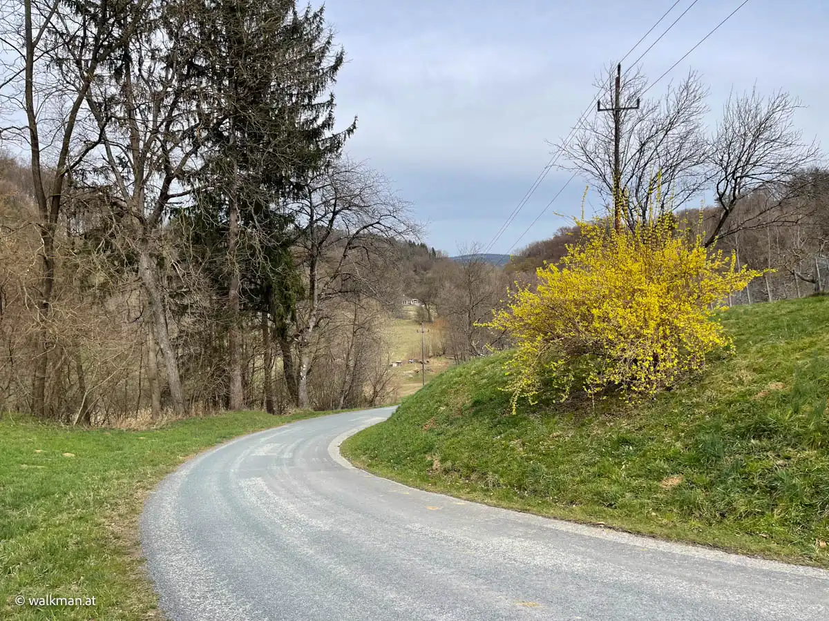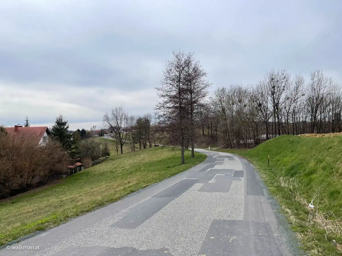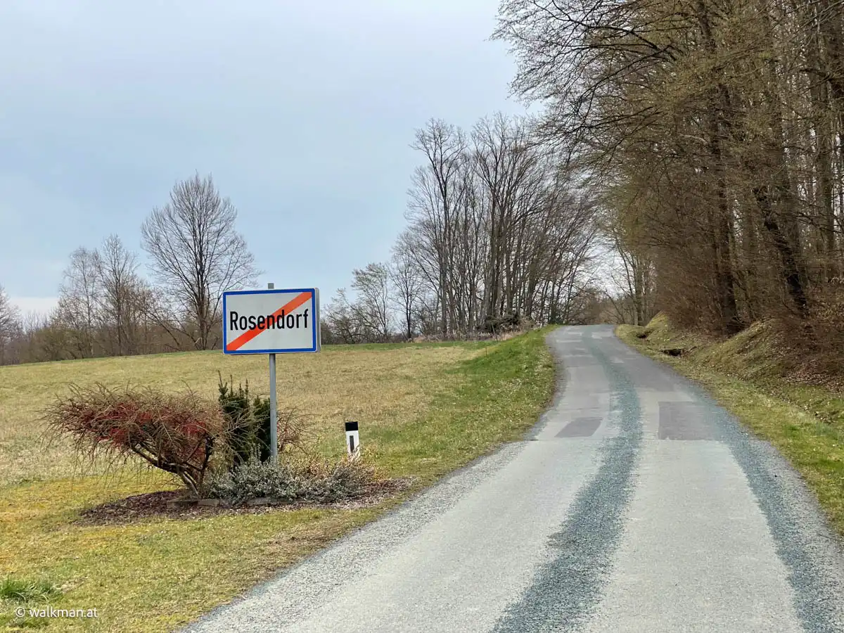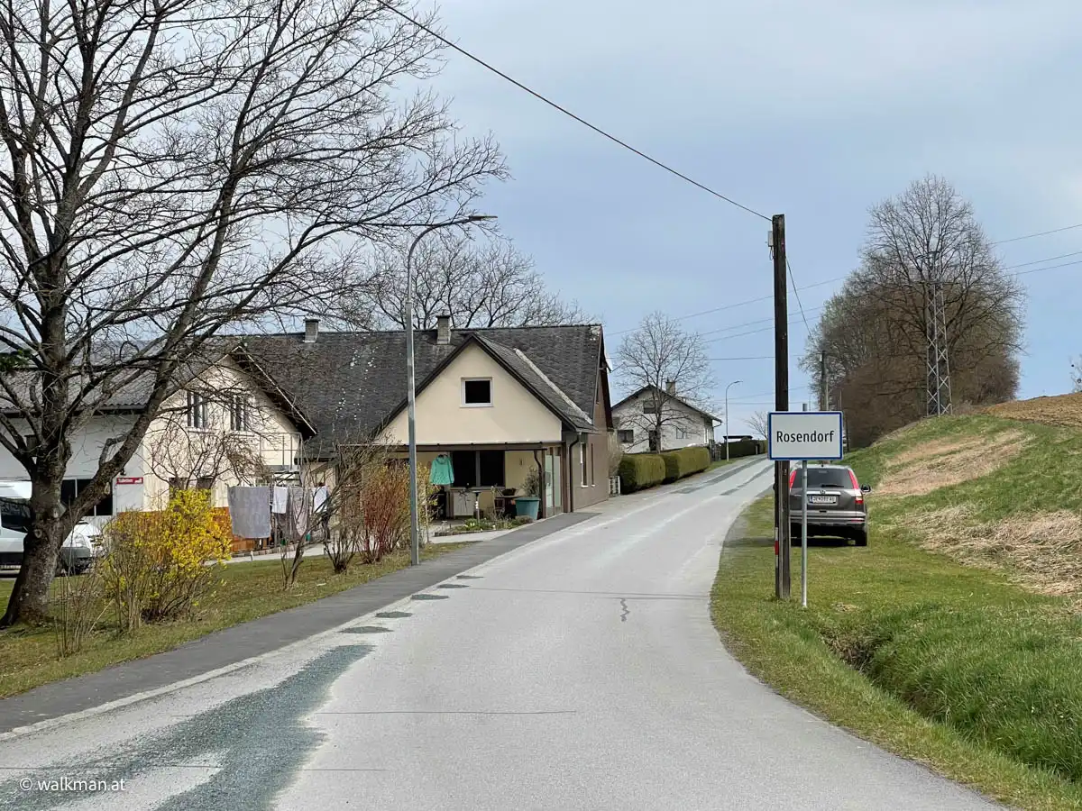 Also stellenweise im Gras, dem Split ausweichend, runter marschierend erreiche ich nach insgesamt einer guten Stunde Wegzeit die Talsohle und meine nächste Straßenkreuzung. Hier halte ich mich abermals nach rechts und bin jetzt schon wieder knapp vor Rosendorf. Bei Kilometer 4,16 und der nächsten Kreuzung spaziere ich auch schon an der Ortstafel vorbei.
