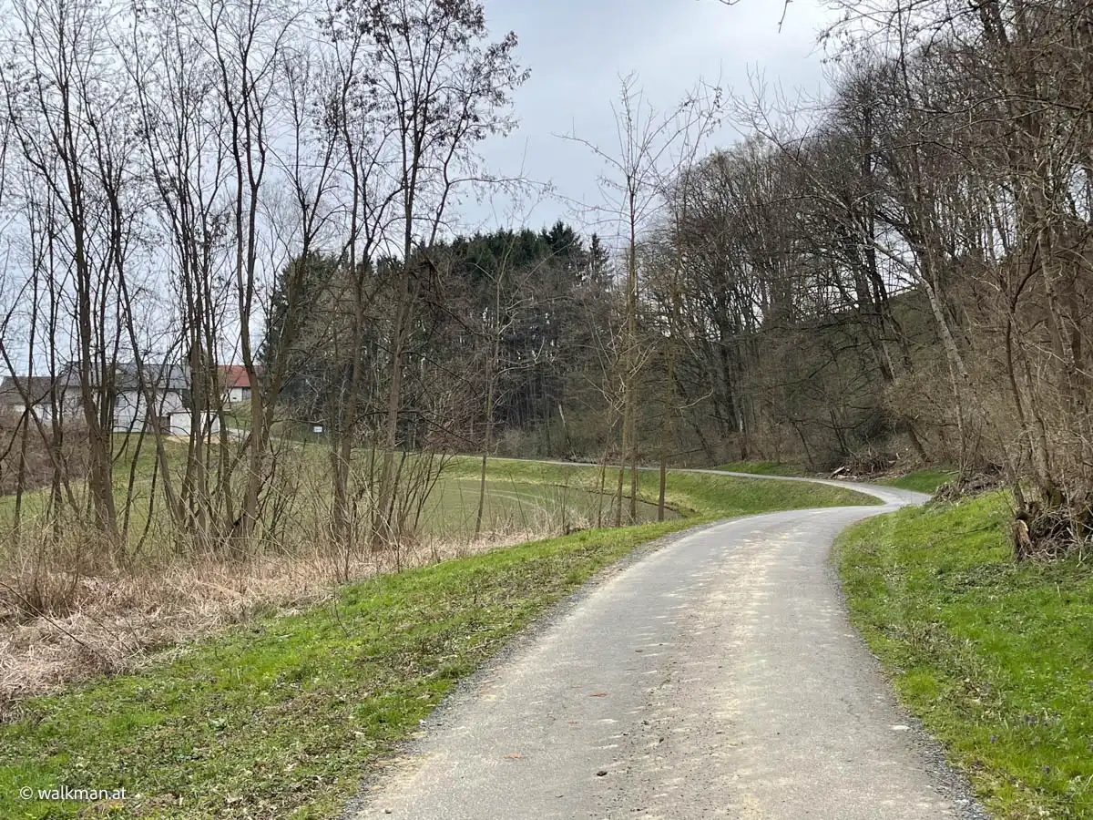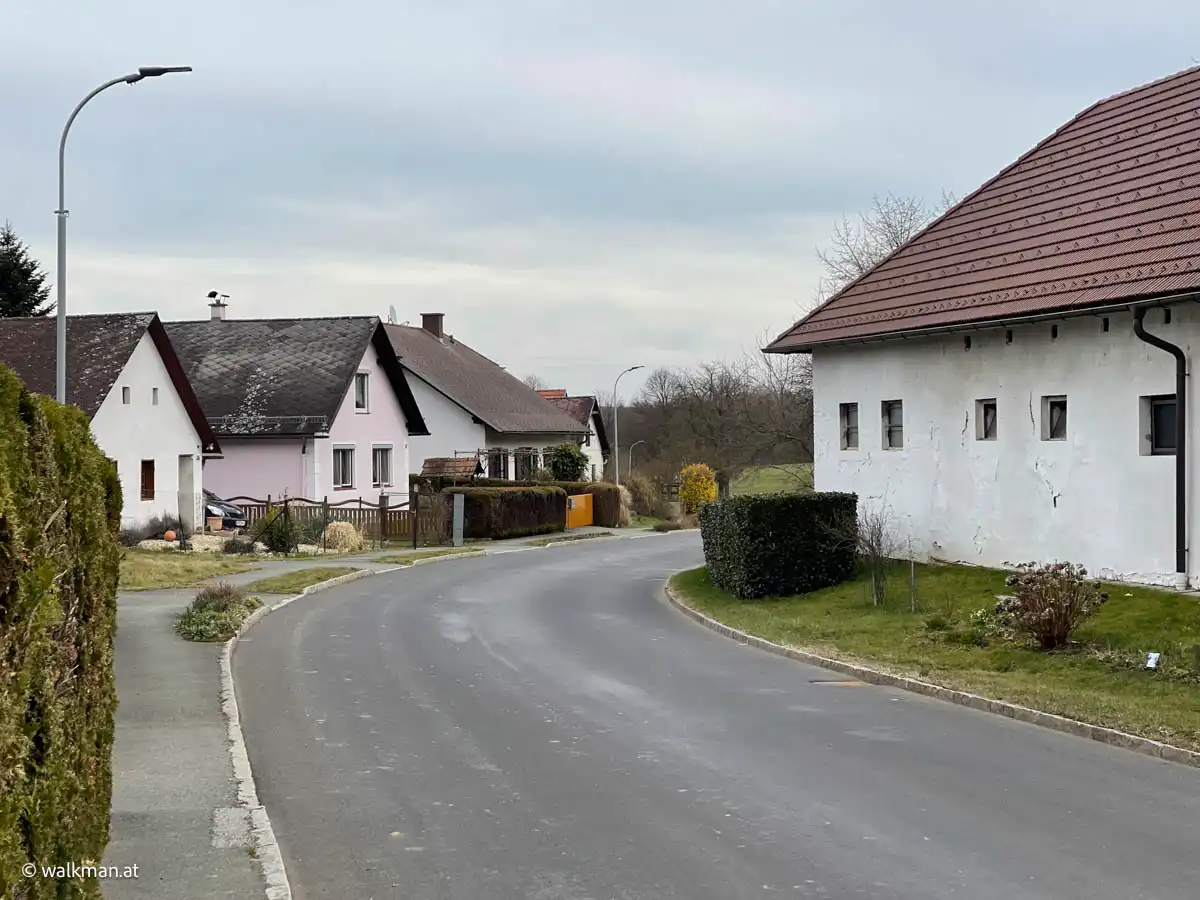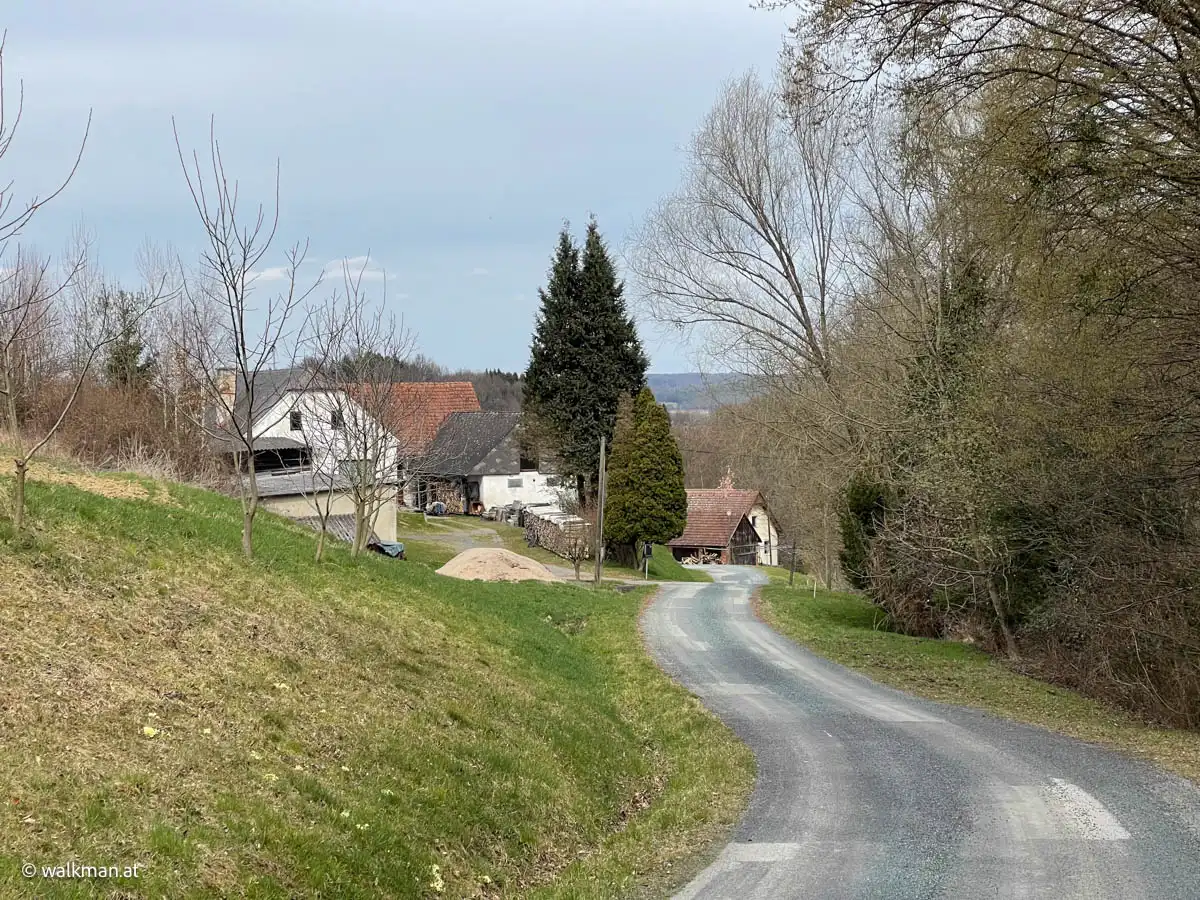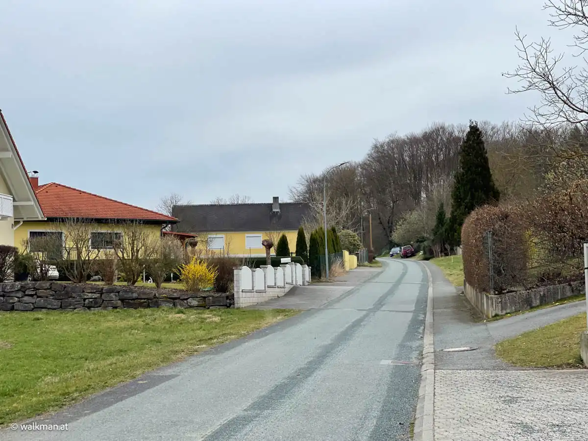 Also stellenweise im Gras, dem Split ausweichend, runter marschierend erreiche ich nach insgesamt einer guten Stunde Wegzeit die Talsohle und meine nächste Straßenkreuzung. Hier halte ich mich abermals nach rechts und bin jetzt schon wieder knapp vor Rosendorf. Bei Kilometer 4,16 und der nächsten Kreuzung spaziere ich auch schon an der Ortstafel vorbei.