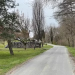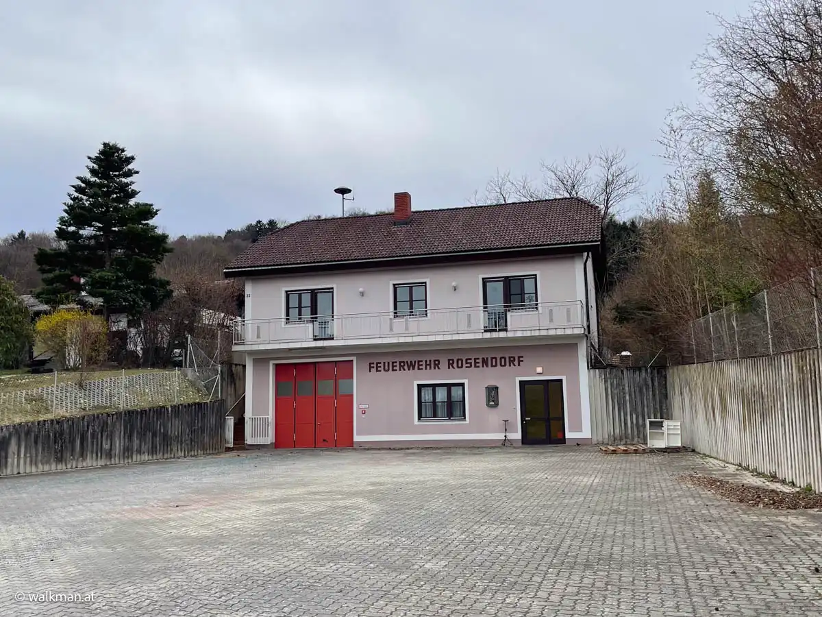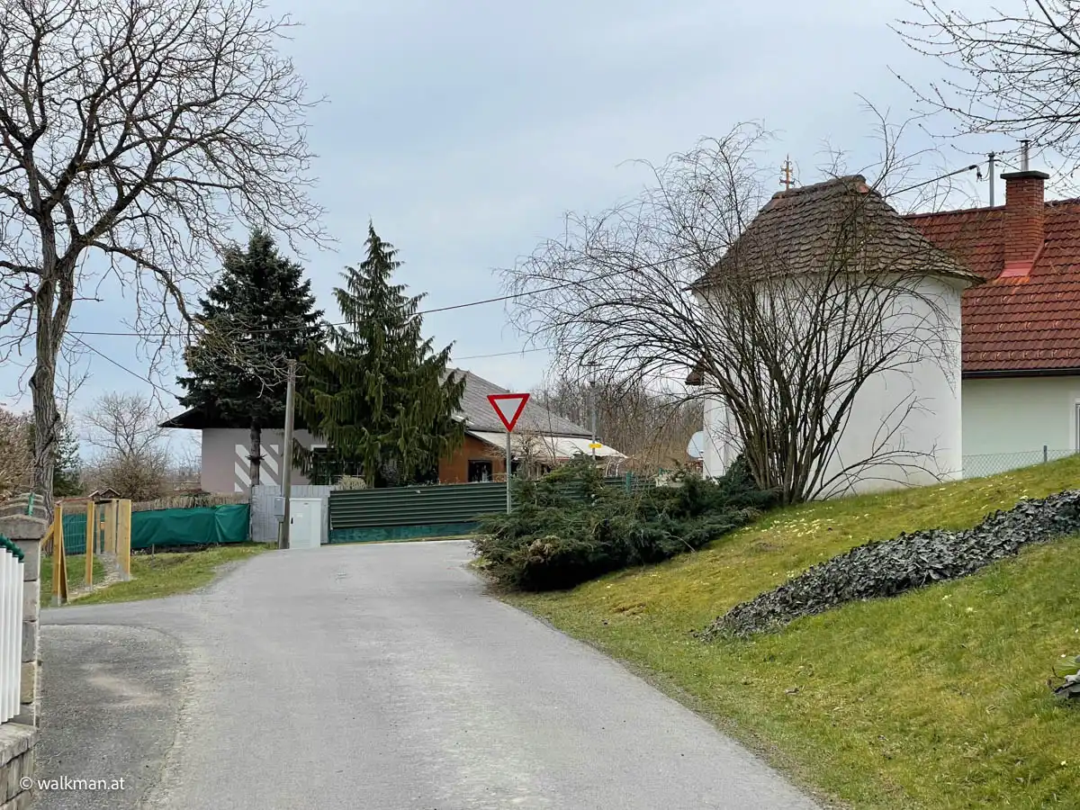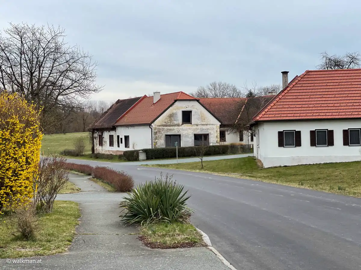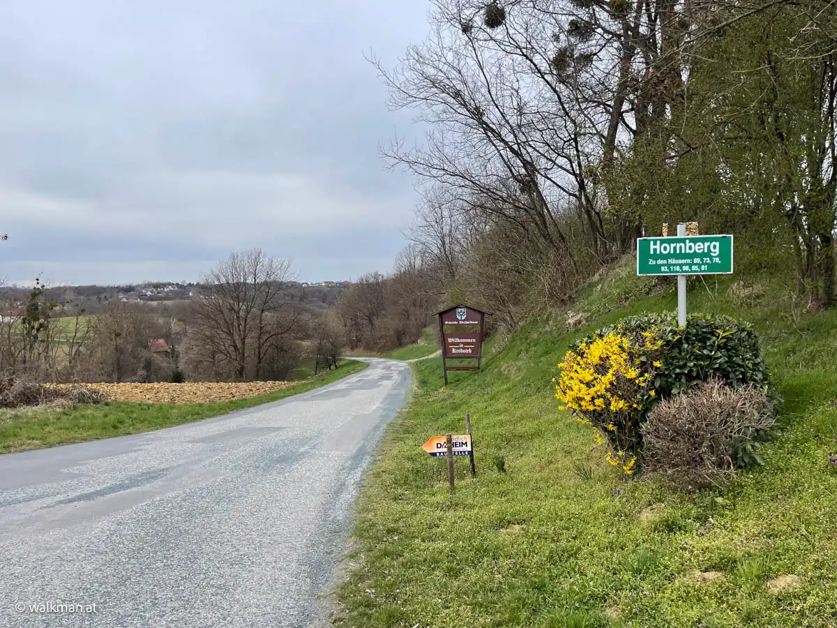 Also stellenweise im Gras, dem Split ausweichend, runter marschierend erreiche ich nach insgesamt einer guten Stunde Wegzeit die Talsohle und meine nächste Straßenkreuzung. Hier halte ich mich abermals nach rechts und bin jetzt schon wieder knapp vor Rosendorf. Bei Kilometer 4,16 und der nächsten Kreuzung spaziere ich auch schon an der Ortstafel vorbei.