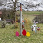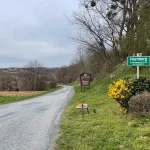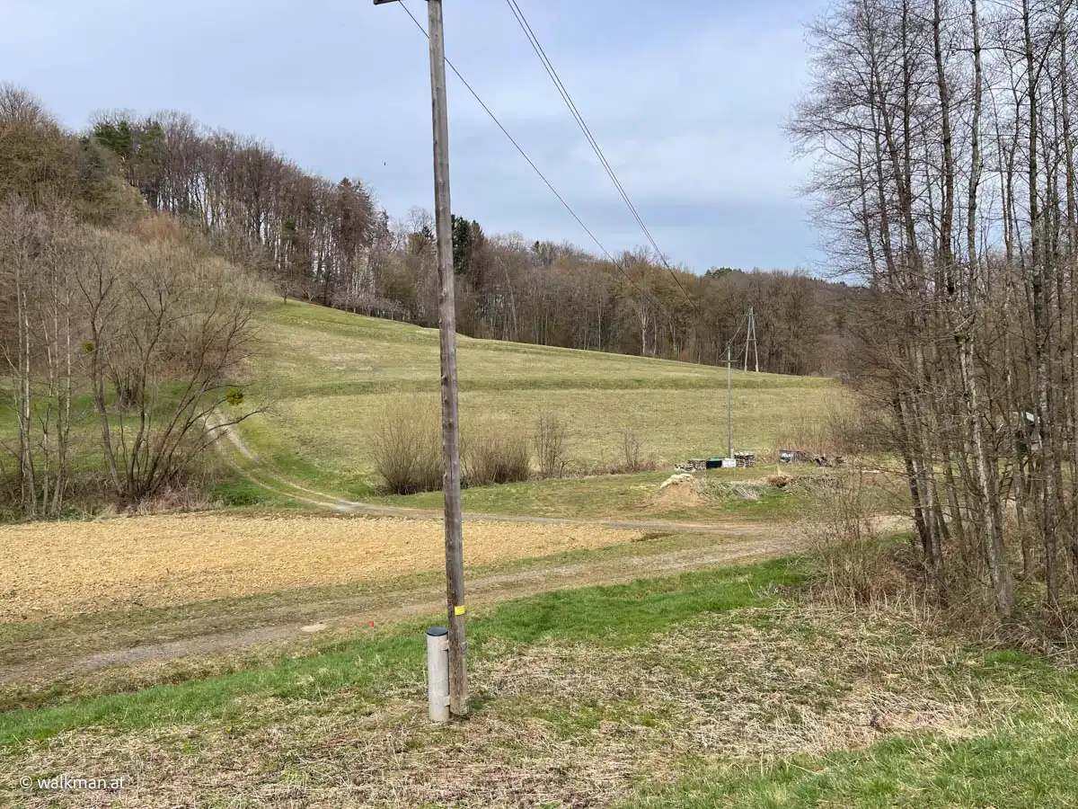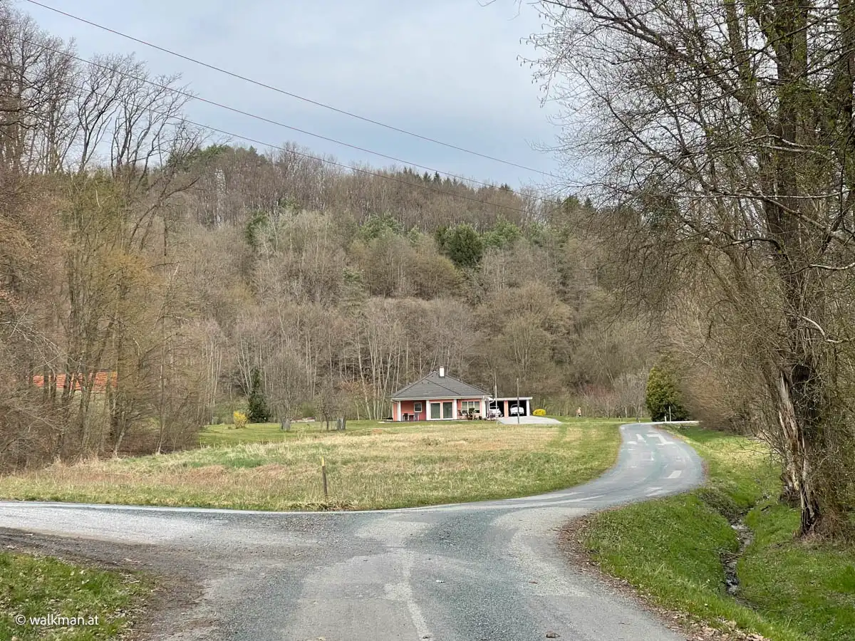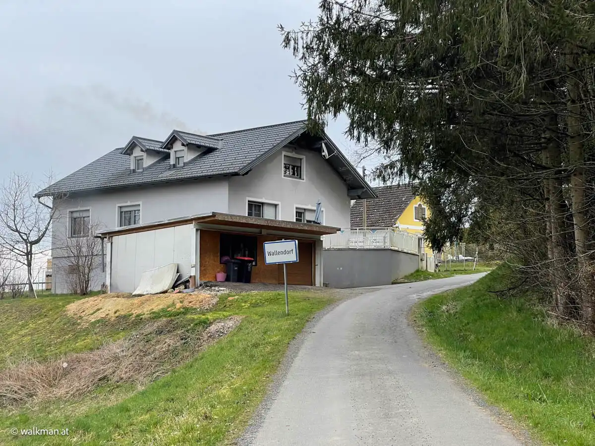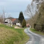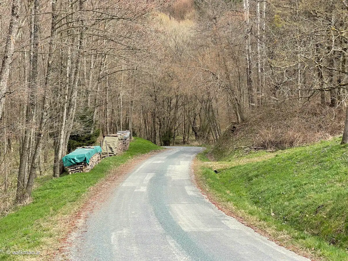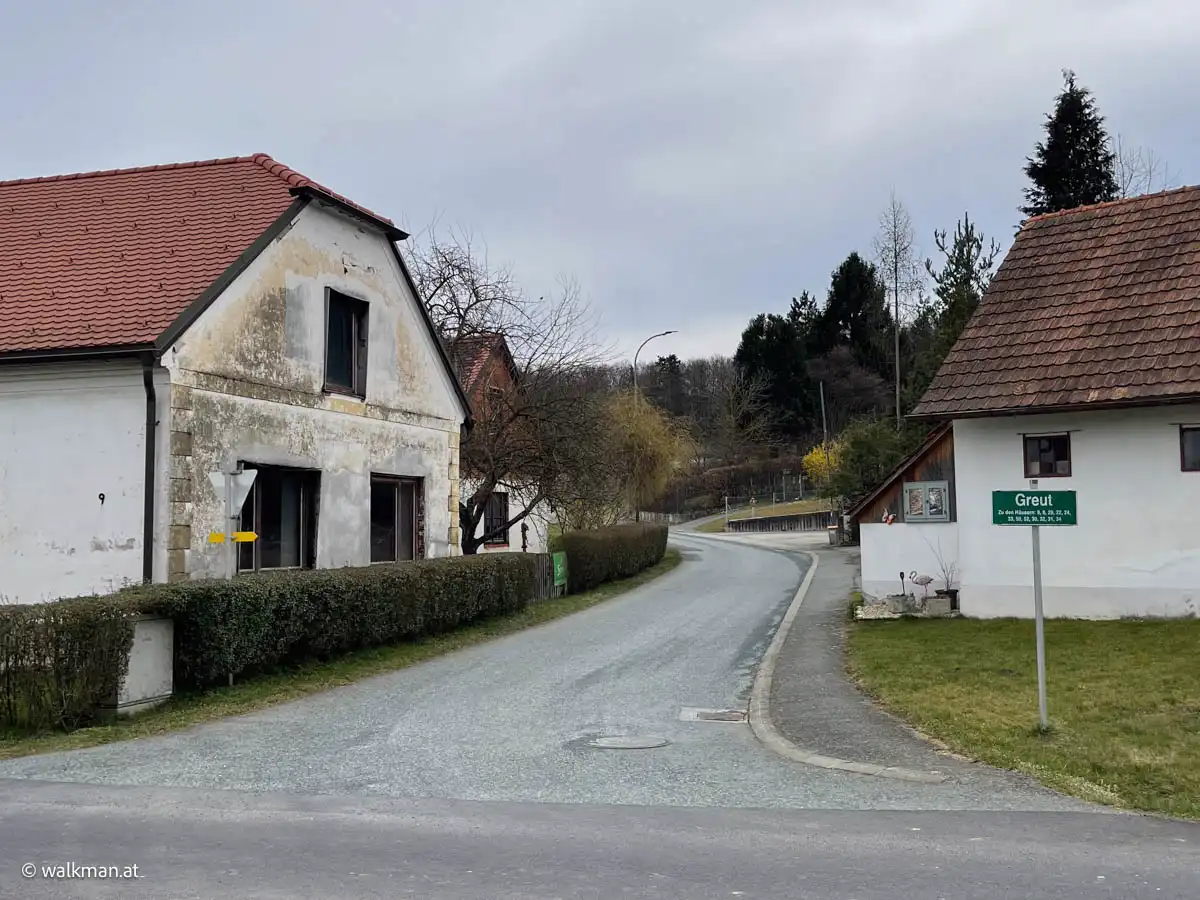 Zunächst führt die Route ein Stück weit die Hauptstraße entlang, um bald nach rechts hinein zu biegen, auf einem asphaltierten Güterweg, Richtung Wallendorf. Oder Richtung „Greut“. So bezeichnet zumindest ein grünes Schild den offensichtlichen Ortsteil, in dem ich nun wandere.