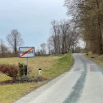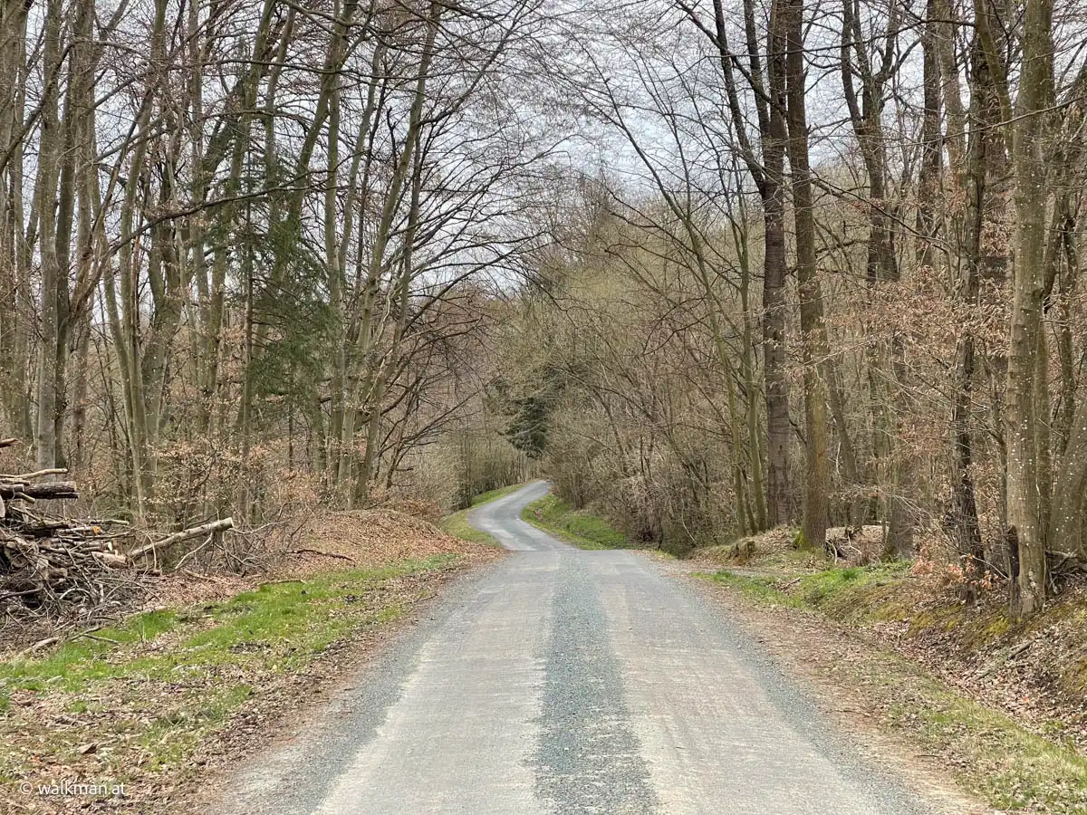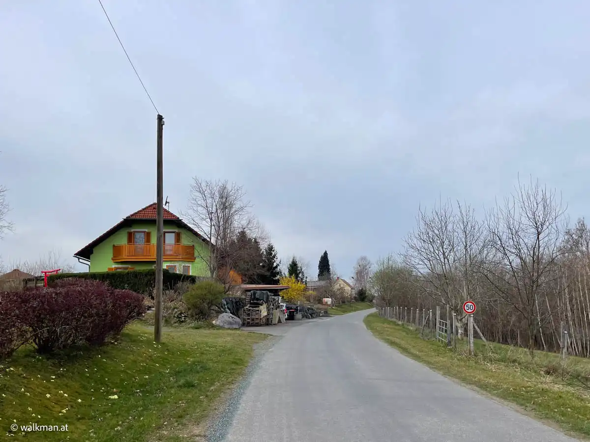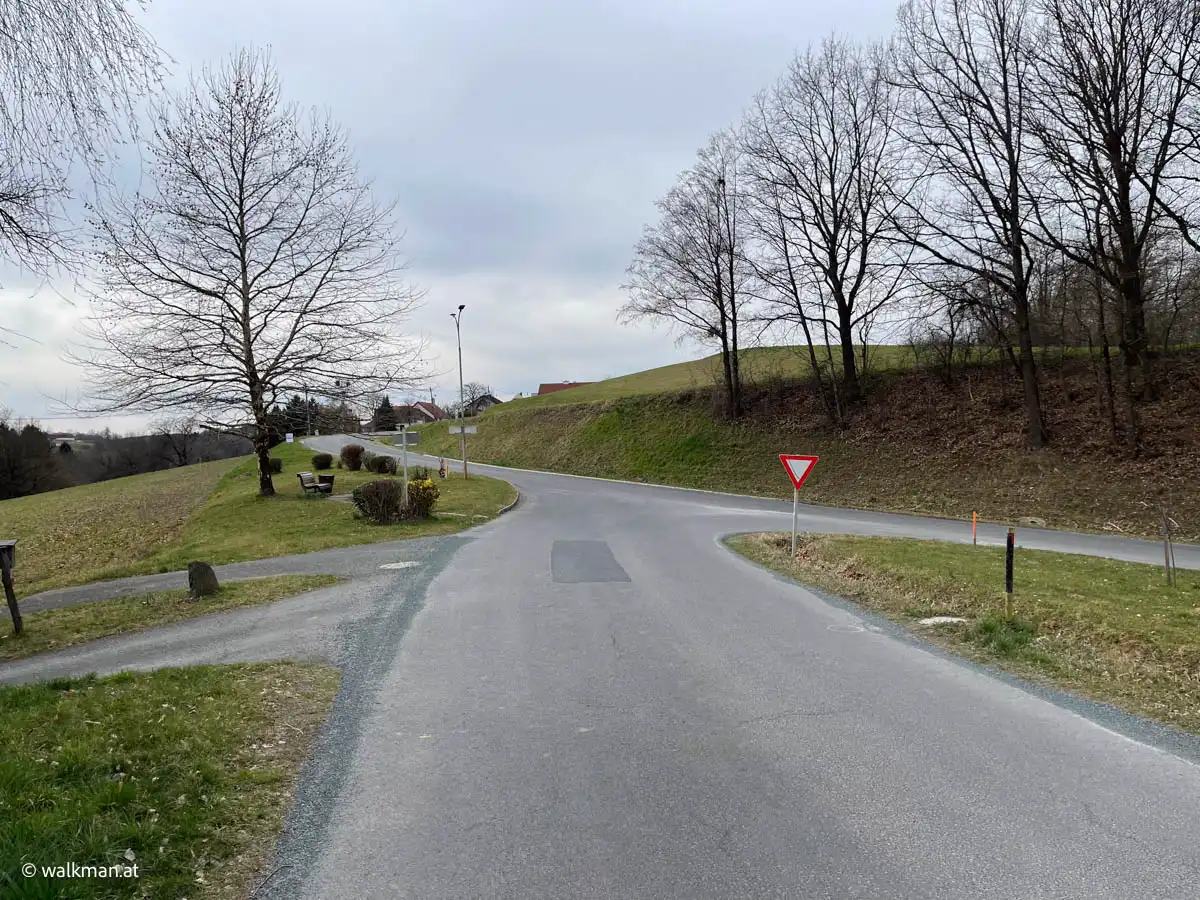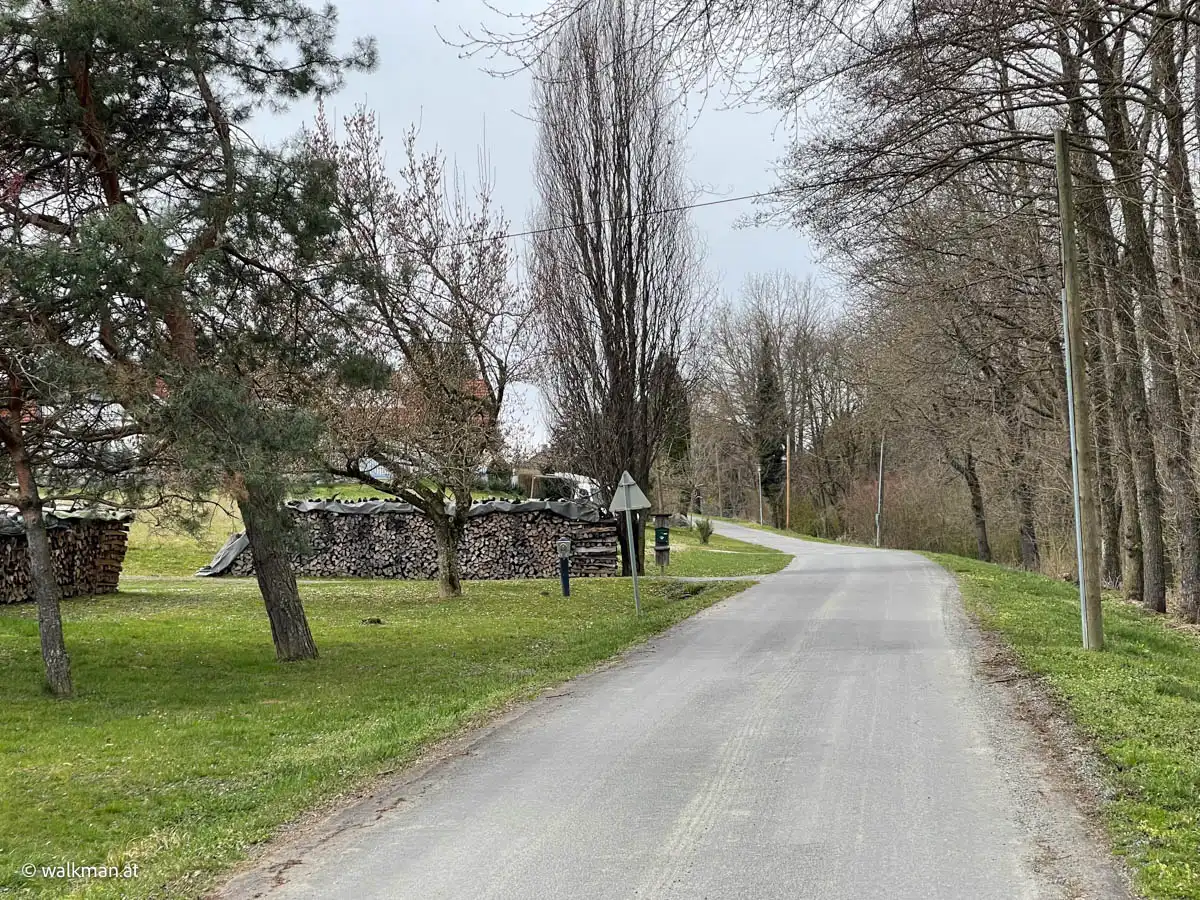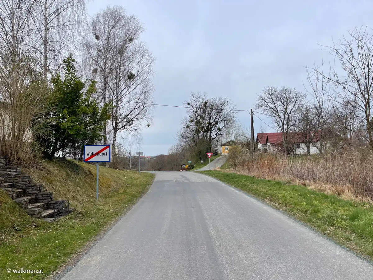 Kurz davor hatte ich auch eine weitere Wegkreuzung passiert an der ich mich, gemäß meiner Routen-Vorgabe, rechts gehalten habe. Und ab jetzt wird meine Tour richtig, richtig angenehm. Auf leicht abfallender Straße wandere ich wieder aus Wallendorf hinaus. An der Kreuzung, bei der Ortstafel hier, war ich auch bereits vorbei gewandert. Bei meiner Tour von Maria Bild herüber.