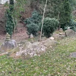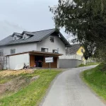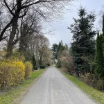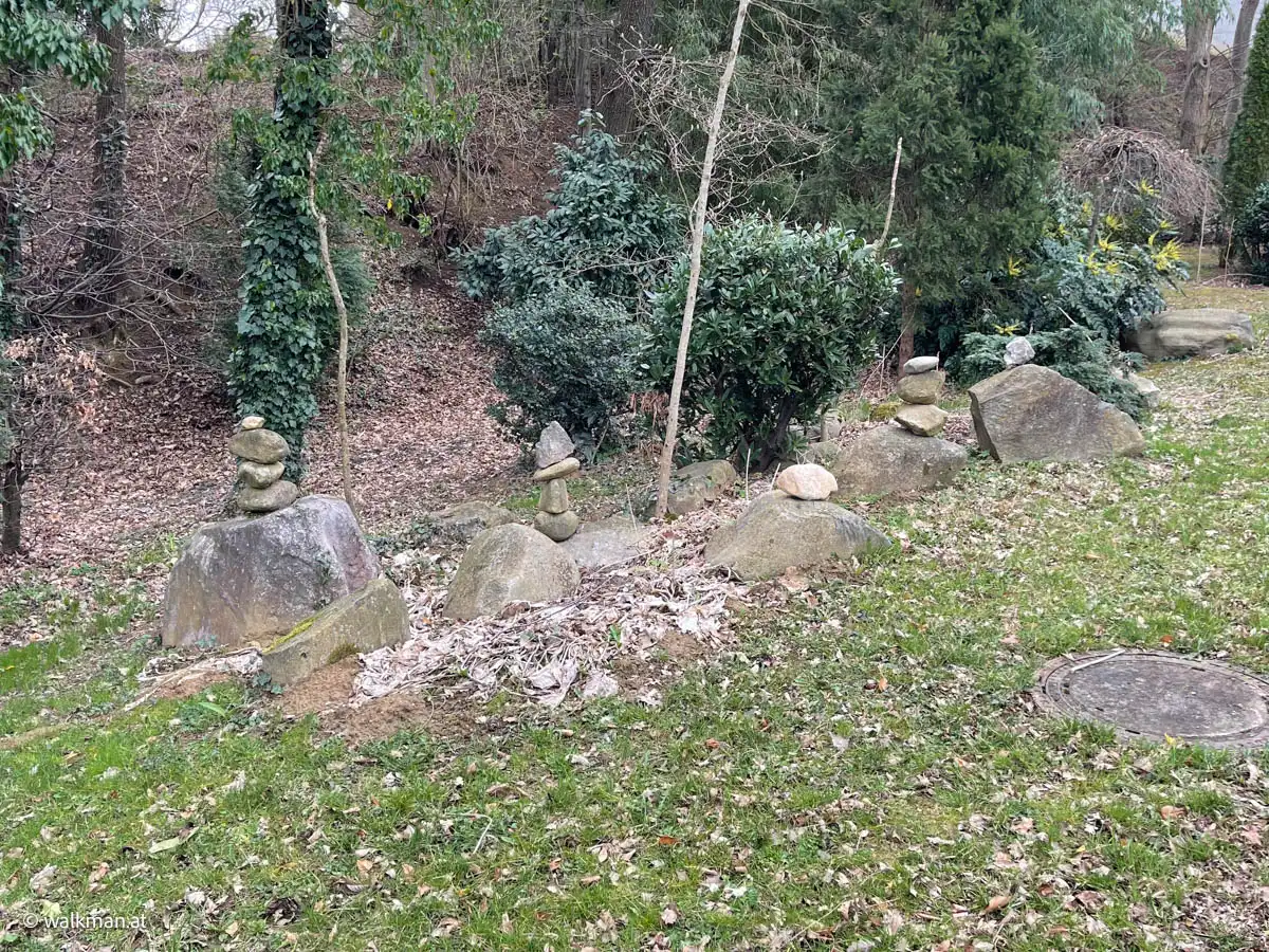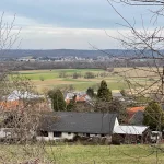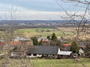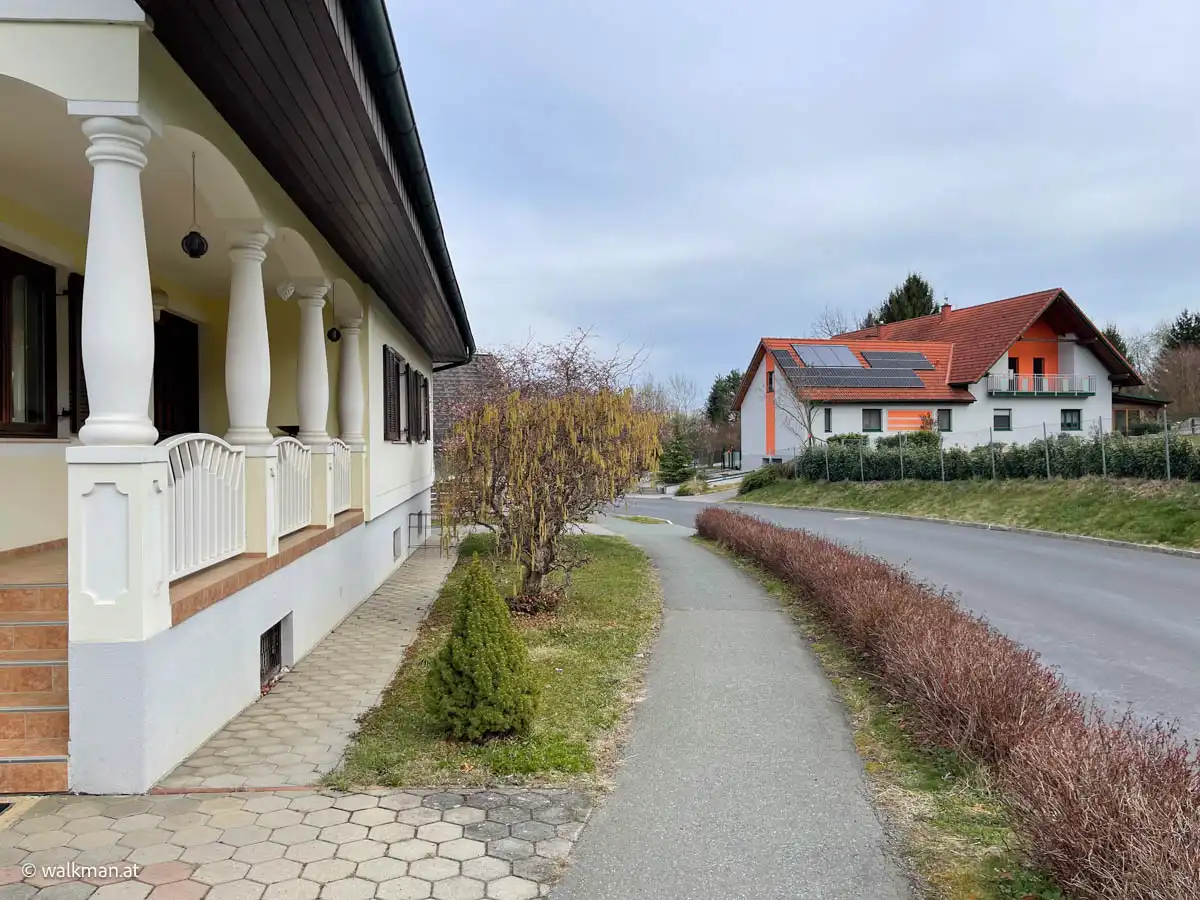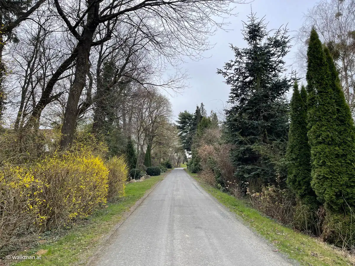 Gefällt mir natürlich und ist mir einige Fotos wert. Außerdem verschafft mir das auch eine nötige Verschnaufpause, bevor ich meinen Weg fortsetze. Deren gibt es dann, bis zum höchsten Punkt noch mehr. Vorbei an schönen Vorgärten und schmucken Häusern mit teils reger Bautätigkeit erreiche ich nach 2,2 Streckenkilometern diesen dann auch. Allerdings ohne Aussicht hier oben. Wald und Häuser verhindern dies.