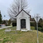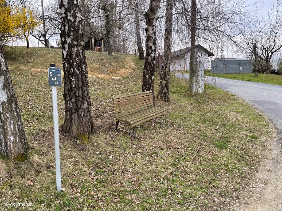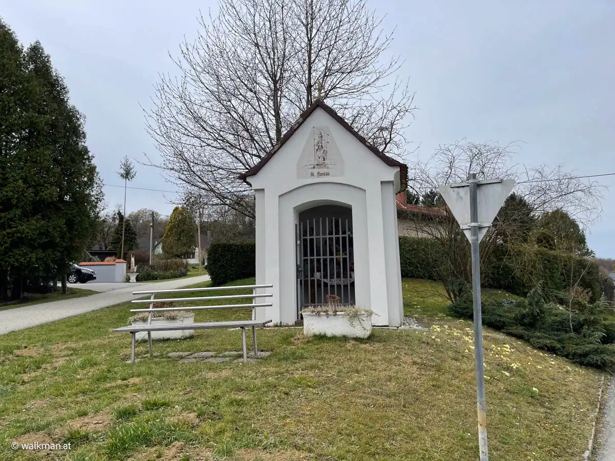 Sei’s drum. Die Straße entlang, diesmal weitgehend flach, erreiche ich bald darauf meinen ersten Abbiegepunkt. Hier, bei der Weg-Kapelle, die dem heiligen Florian gewidmet ist, muss ich mich nun rechts halten. Auch eine Sitzgelegenheit befindet sich neben dieser. Aber nicht für mich. Walkman mag wandern.