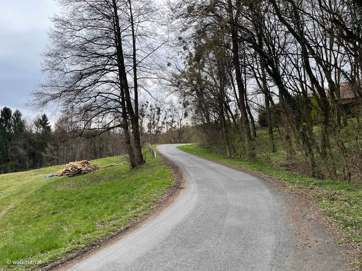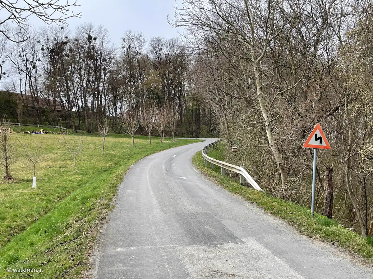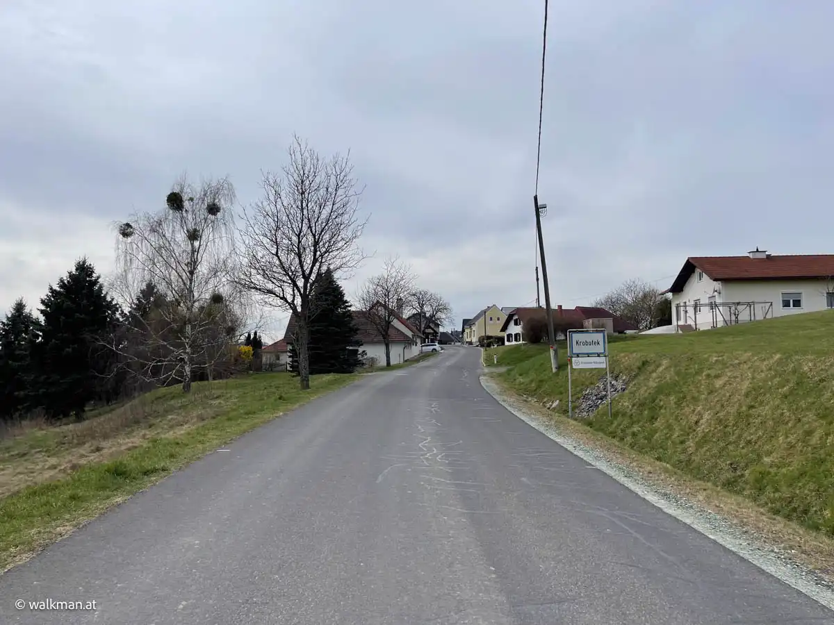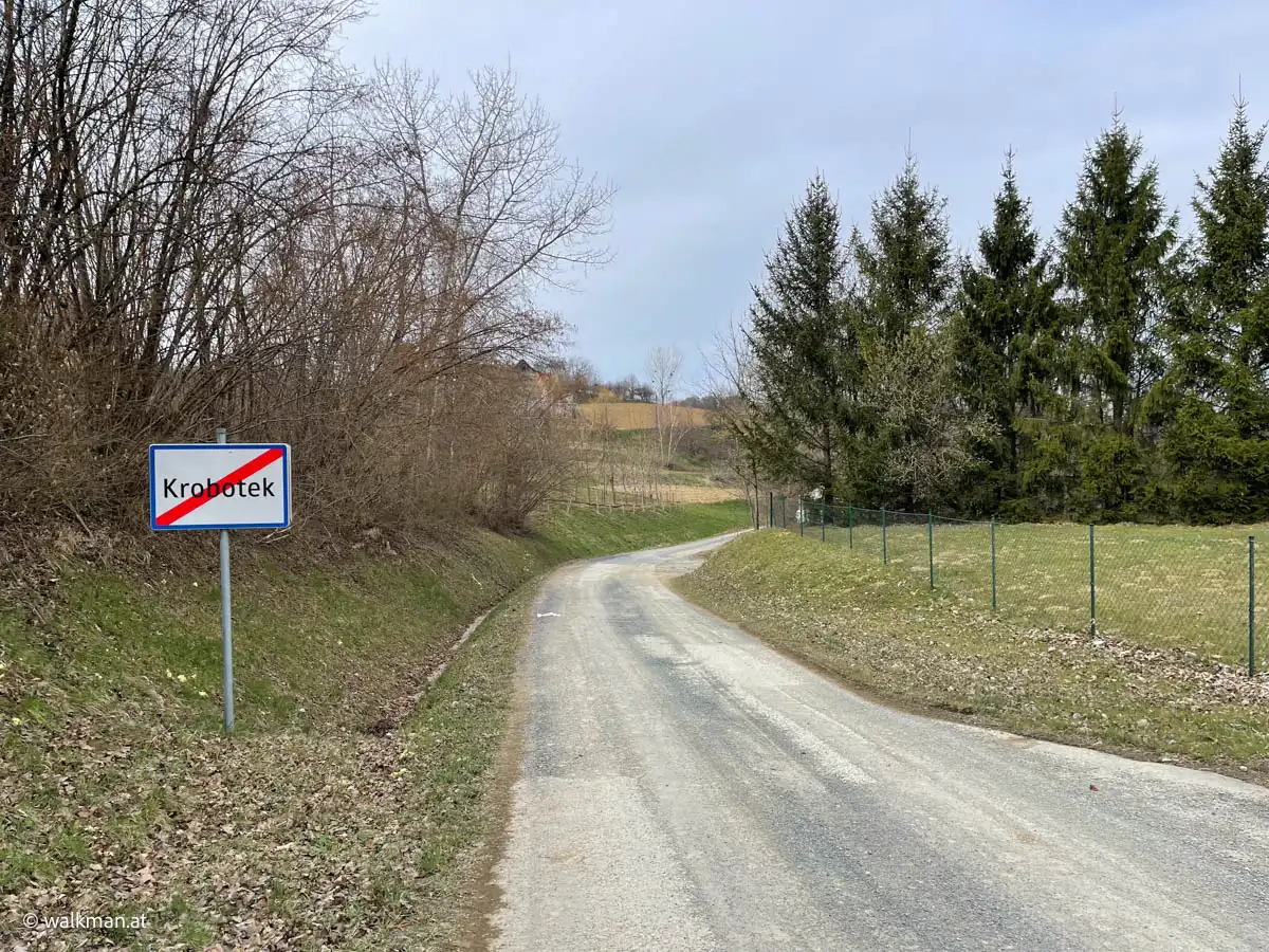 An der Ortstafel von Krobotek vorbei, geht es nun zügig bergab. Auf dem geschwungenen, weiterhin asphaltierten, Weg, muss ich acht geben, nicht auf dem Rollsplit auszurutschen, der hier noch als Überbleibsel des letzten Winters liegt. Als weitgehend sinnloses Überbleibsel. Wir hatten heuer, seit November, weder Schnee noch Regen. Zumindest bis vor kurzem. Im März hatte es nun doch schon ein paar Mal geregnet. War aber auch schon hoch an der Zeit für die ausgetrocknete Natur.