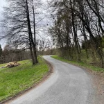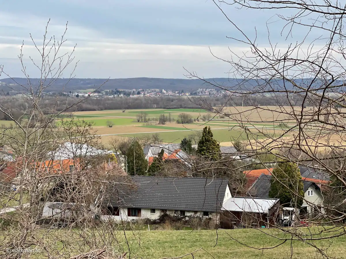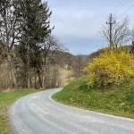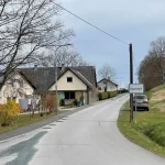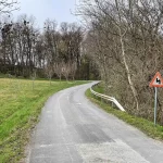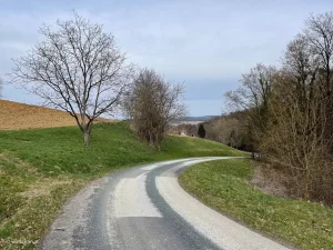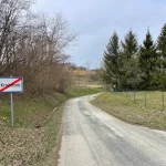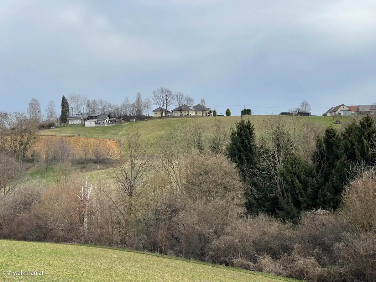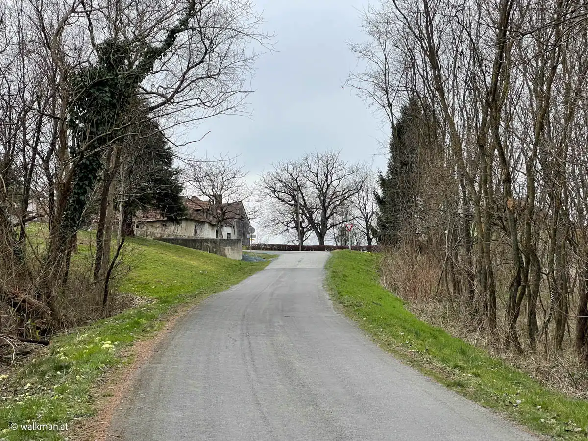 An der Ortstafel von Krobotek vorbei, geht es nun zügig bergab. Auf dem geschwungenen, weiterhin asphaltierten, Weg, muss ich acht geben, nicht auf dem Rollsplit auszurutschen, der hier noch als Überbleibsel des letzten Winters liegt. Als weitgehend sinnloses Überbleibsel. Wir hatten heuer, seit November, weder Schnee noch Regen. Zumindest bis vor kurzem. Im März hatte es nun doch schon ein paar Mal geregnet. War aber auch schon hoch an der Zeit für die ausgetrocknete Natur.