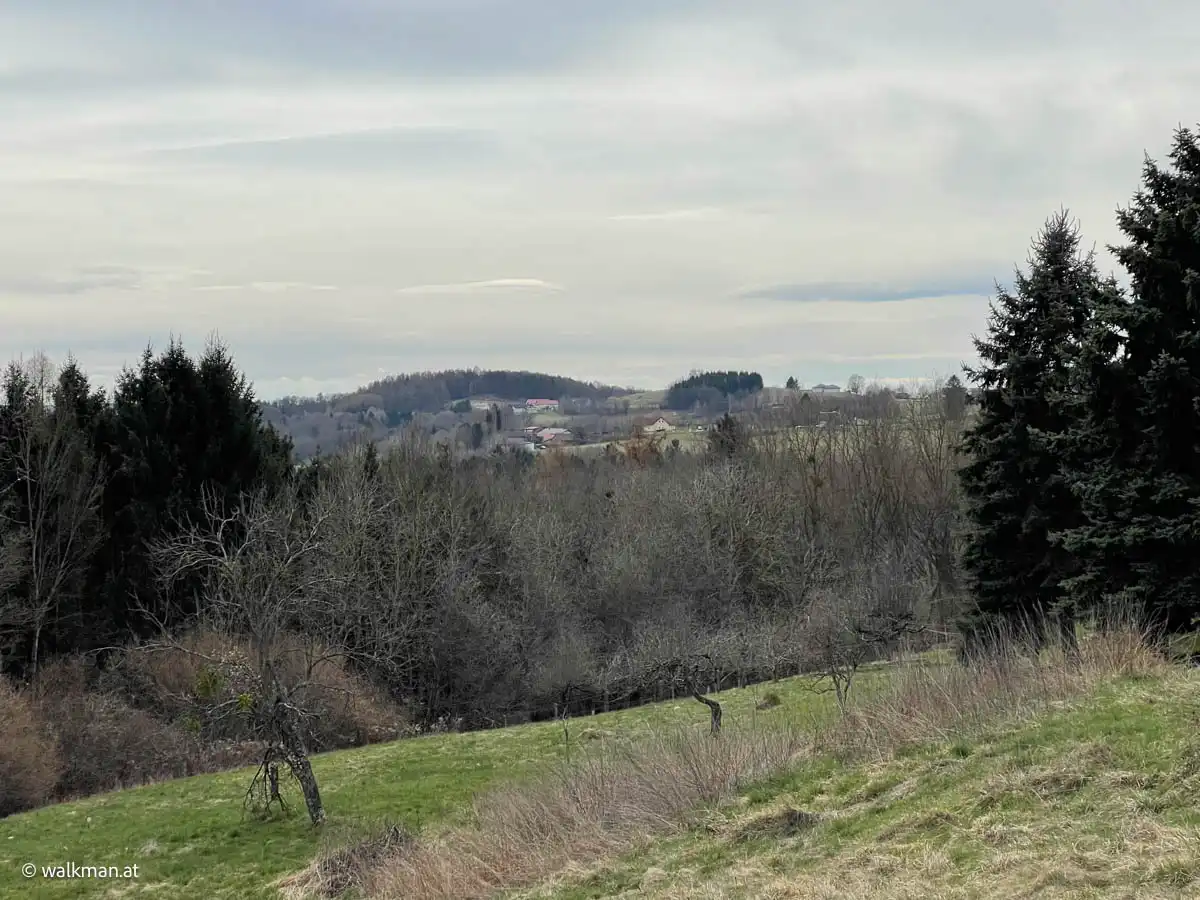 Nach dem ersten Drittel dieses Anstiegs hat man, sofern man sich umdreht, auch eine tolle Aussicht. Von Heiligenkreuz über Poppendorf bis nach Eltendorf und Teilen von Dobersdorf reicht hier der Blick über das schöne Lafnitztal. Und natürlich auch die Kulisse der geschwungenen Hügel dahinter. So richtig Südburgenland eben.
