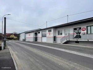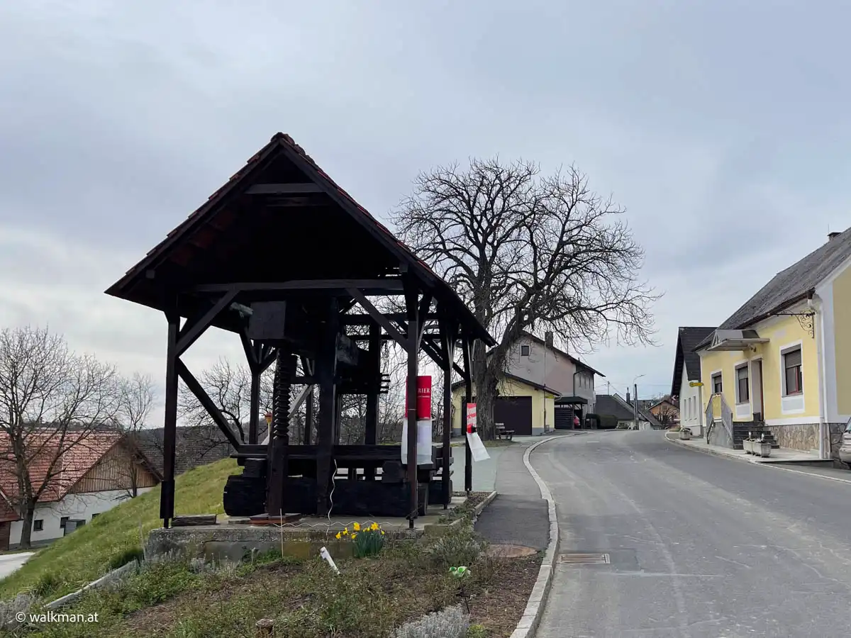 Also, vorbei an der Kreuzung und dem Rastplatz, der sich hier befindet, wandere ich nach Krobotek hinein. Dazu war, bis zur Ortstafel von Krobotek, zwar abermals ein kleiner Anstieg zu bewältigen, aber hey, ich wollte Höhenmeter! Und so lenke ich meine Schritte nun durch den Ort. Vorbei an einer alten Presse und an einem sichtlich großen Abfüllbetrieb für Spirituosen. „Austria Brands“ prangt in großen Buchstaben an der langen Fassade.